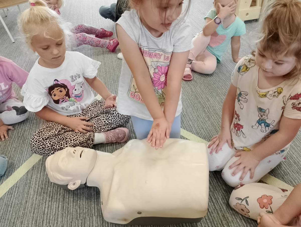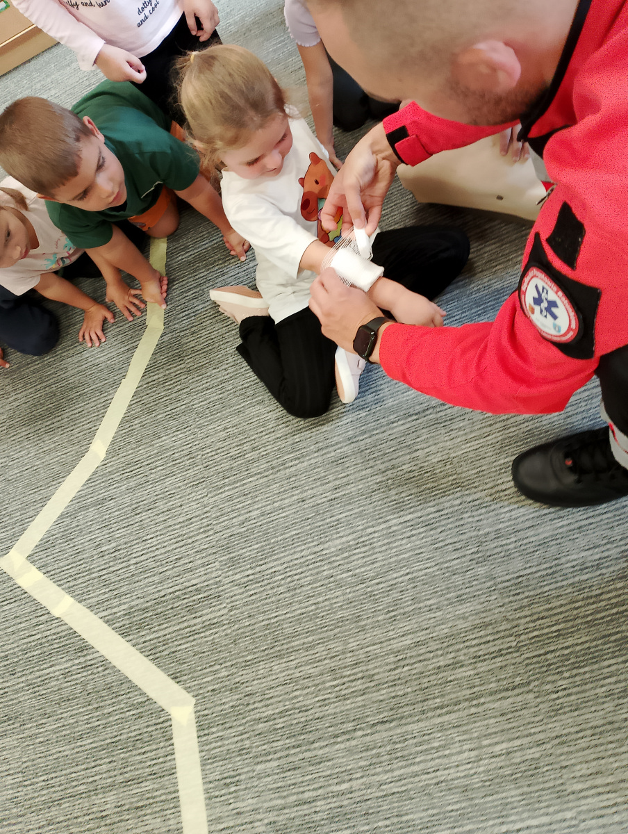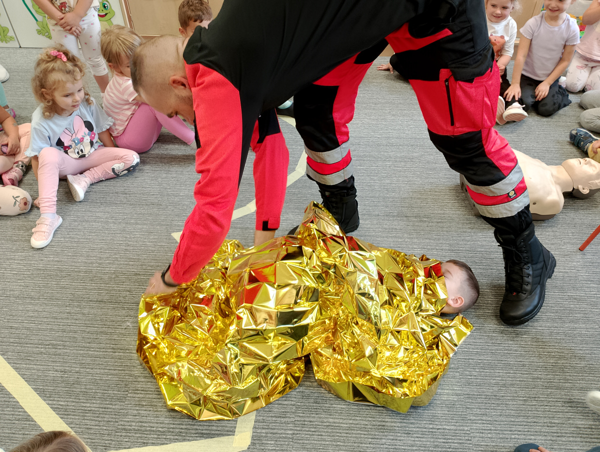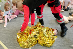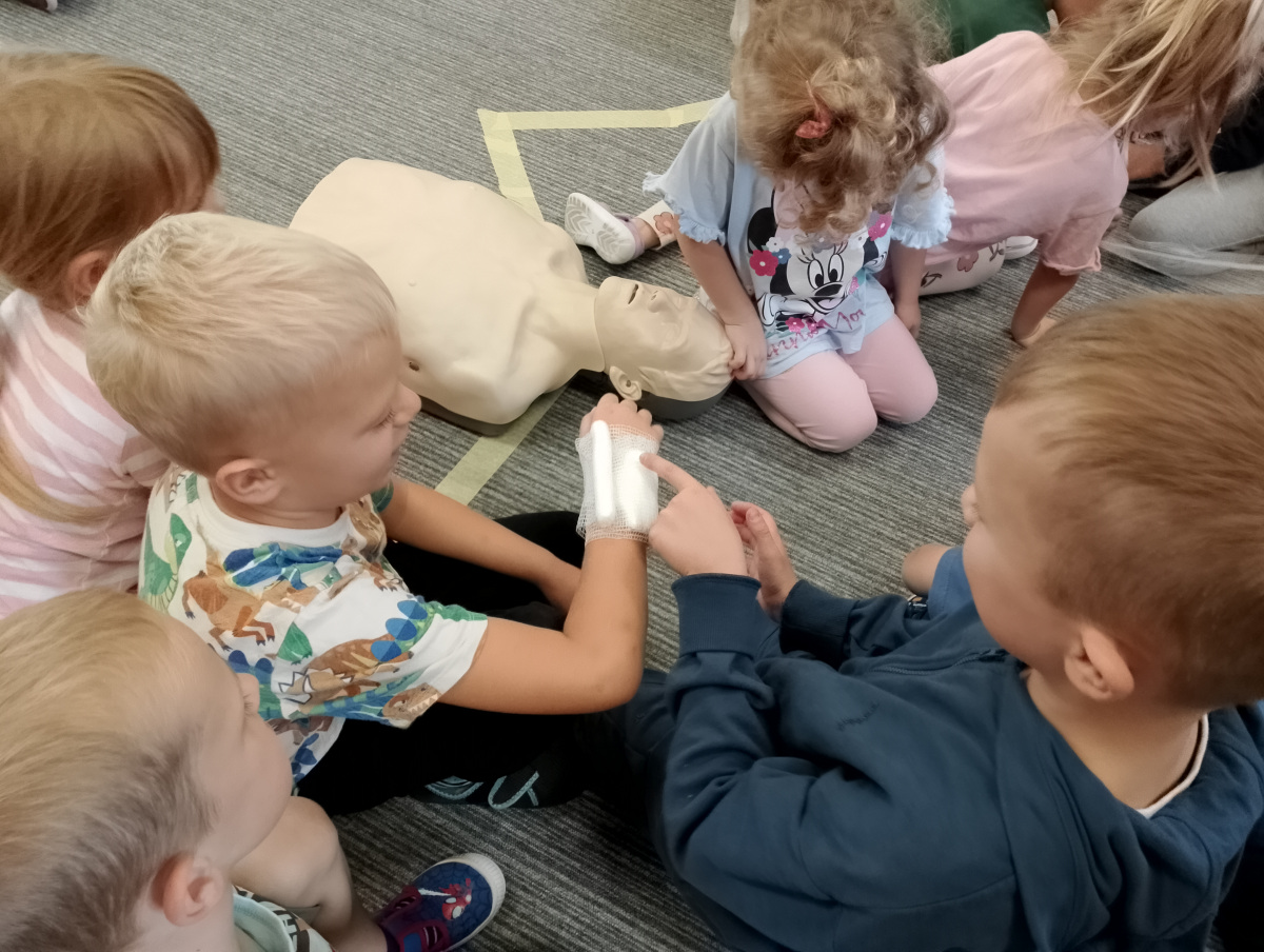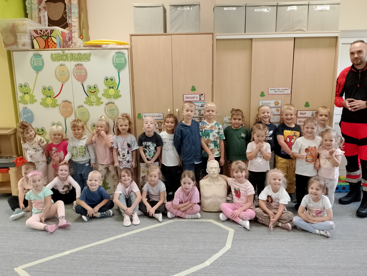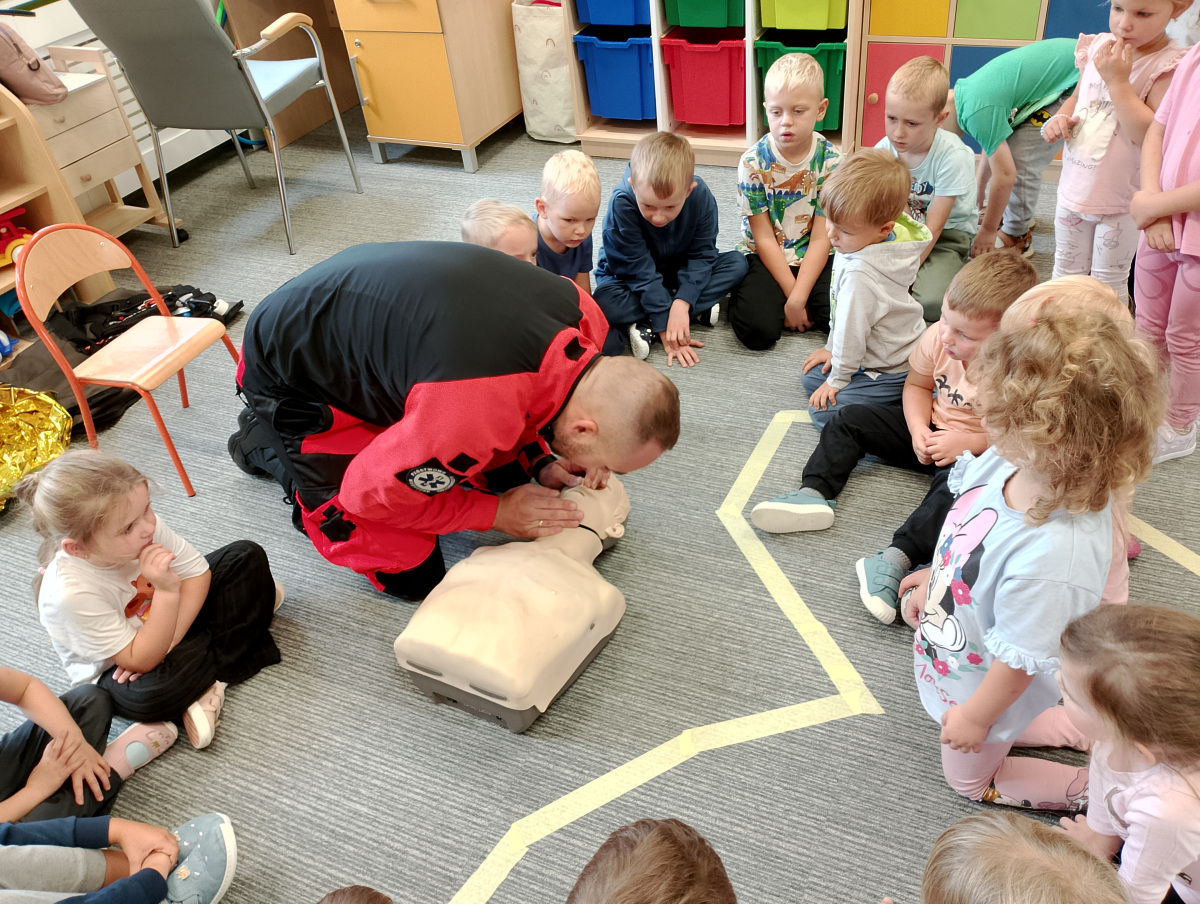 W naszym przedszkolu ostatnio odwiedził nas szczególny gość – ratownik medyczny – pan Bartek, który nie tylko nosi na co dzień strój superbohatera (mundur medyczny), ale też ratuje ludzkie życie! Dzięki niemu dowiedzieliśmy się: co zrobić, gdy ktoś zasłabnie, jak wezwać pomoc (numer 112 mamy w małym paluszku!) oraz jak wykonać prostą resuscytację (na fantomie szło nam świetnie!)  Pan Bartek pokazał nam również, jak prawidłowo zakładać opatrunek i nie ukrywamy, że bandażowanie kolegów i koleżanek sprawiło nam mnóstwo radości. Na zakończenie każde dziecko mogło przymierzyć stetoskop i poczuć się jak prawdziwy doktor lub pielęgniarka! Nie zabrakło oczywiście podziękowań i wspólnego zdjęcia!