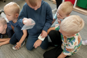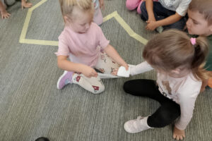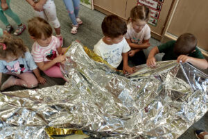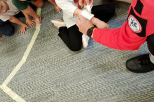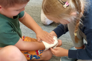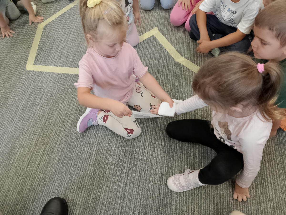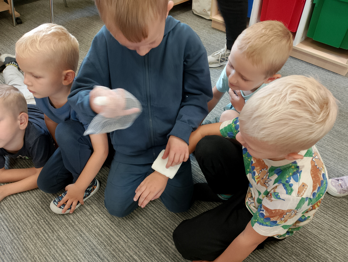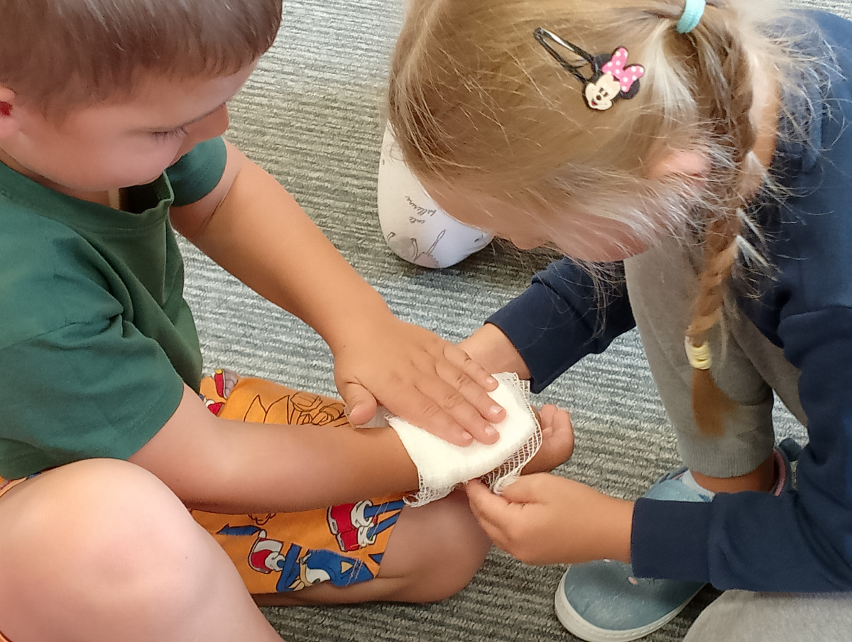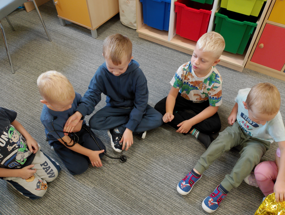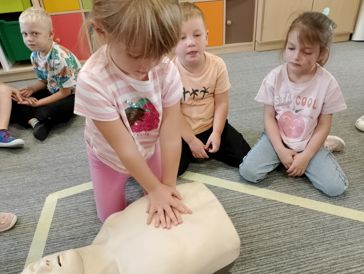 W naszym przedszkolu ostatnio odwiedził nas szczególny gość – ratownik medyczny – pan Bartek, który nie tylko nosi na co dzień strój superbohatera (mundur medyczny), ale też ratuje ludzkie życie! Dzięki niemu dowiedzieliśmy się: co zrobić, gdy ktoś zasłabnie, jak wezwać pomoc (numer 112 mamy w małym paluszku!) oraz jak wykonać prostą resuscytację (na fantomie szło nam świetnie!)  Pan Bartek pokazał nam również, jak prawidłowo zakładać opatrunek i nie ukrywamy, że bandażowanie kolegów i koleżanek sprawiło nam mnóstwo radości. Na zakończenie każde dziecko mogło przymierzyć stetoskop i poczuć się jak prawdziwy doktor lub pielęgniarka! Nie zabrakło oczywiście podziękowań i wspólnego zdjęcia!