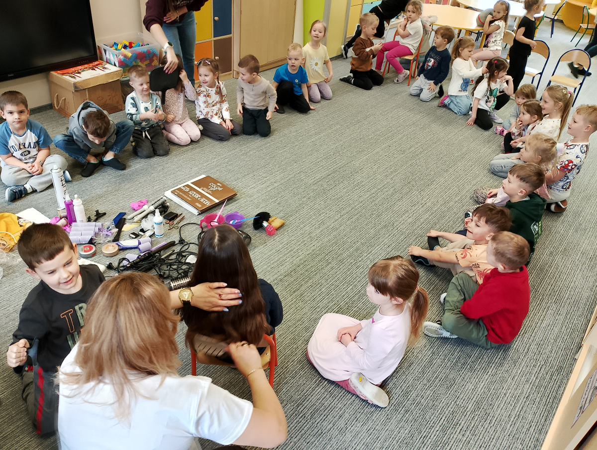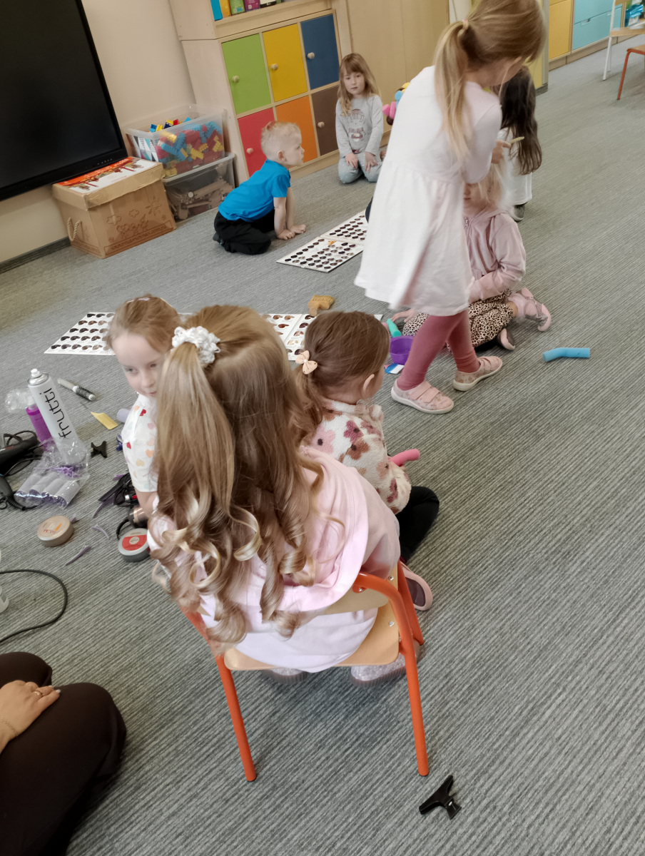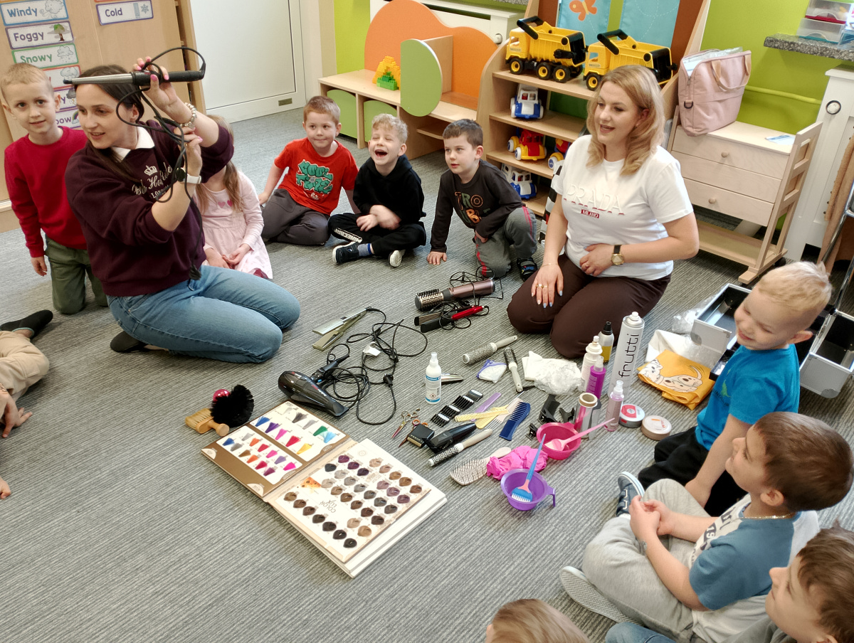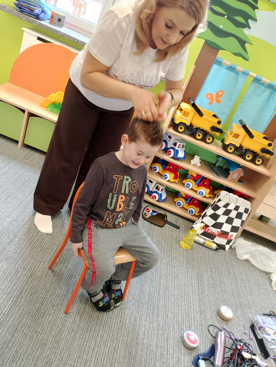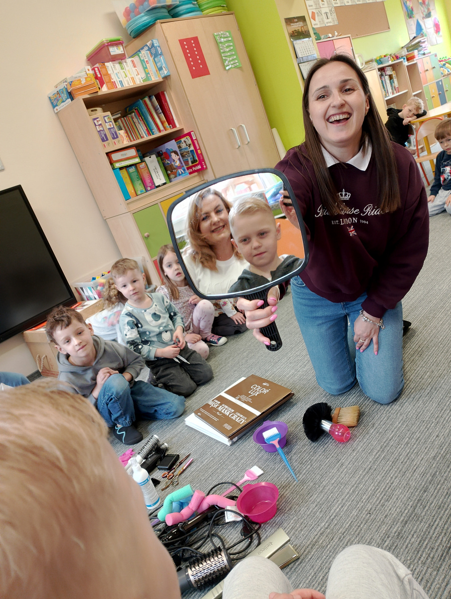 W ramach zajęć z preorientacji zawodowej odwiedził nas wyjątkowy gość – fryzjerka, Pani Monika, mama naszego przedszkolaka Tymusia. Podczas spotkania opowiedziała dzieciom o swojej pracy, przybliżając zawód fryzjera w ciekawy i przystępny sposób. Przedszkolaki miały okazję zobaczyć różnorodne narzędzia fryzjerskie, palety kolorów oraz profesjonalny sprzęt wykorzystywany w salonie. Największą atrakcją okazała się część praktyczna – dzieci z ogromnym zaangażowaniem wcielały się zarówno w rolę fryzjera, tworząc fryzury swoim kolegom i koleżankom, jak i w rolę klienta, oddając się w ręce Pani Moniki i innych dzieci.To były cudowne zajęcia, pełne radości, uśmiechu i nowych doświadczeń. Dzieci były zachwycone i aktywnie uczestniczyły we wszystkich proponowanych aktywnościach.