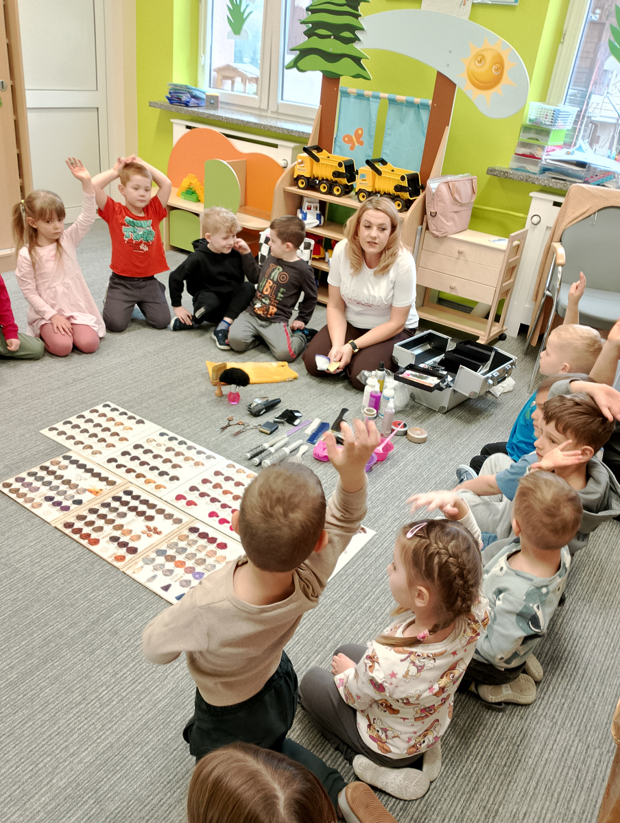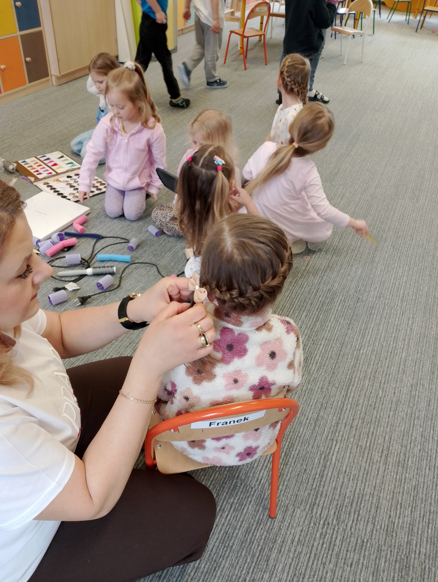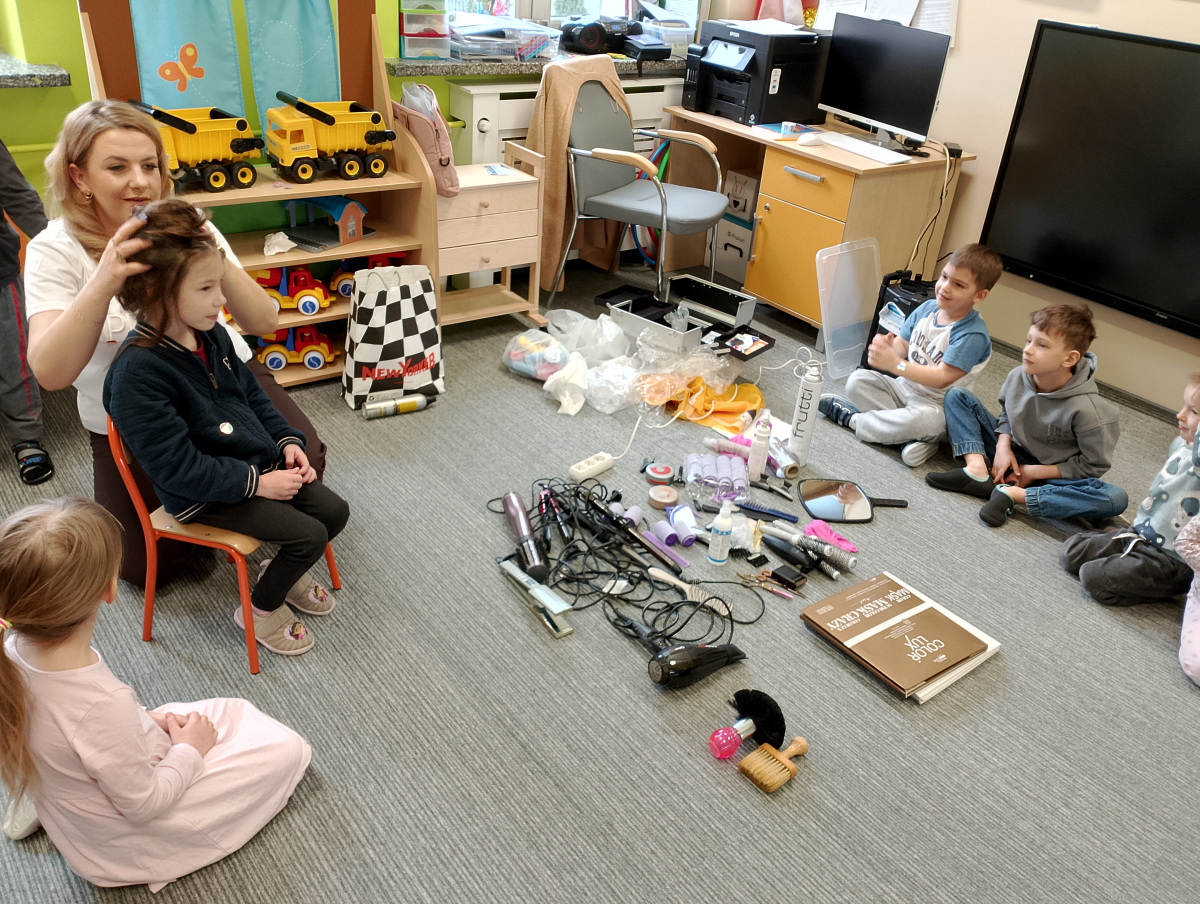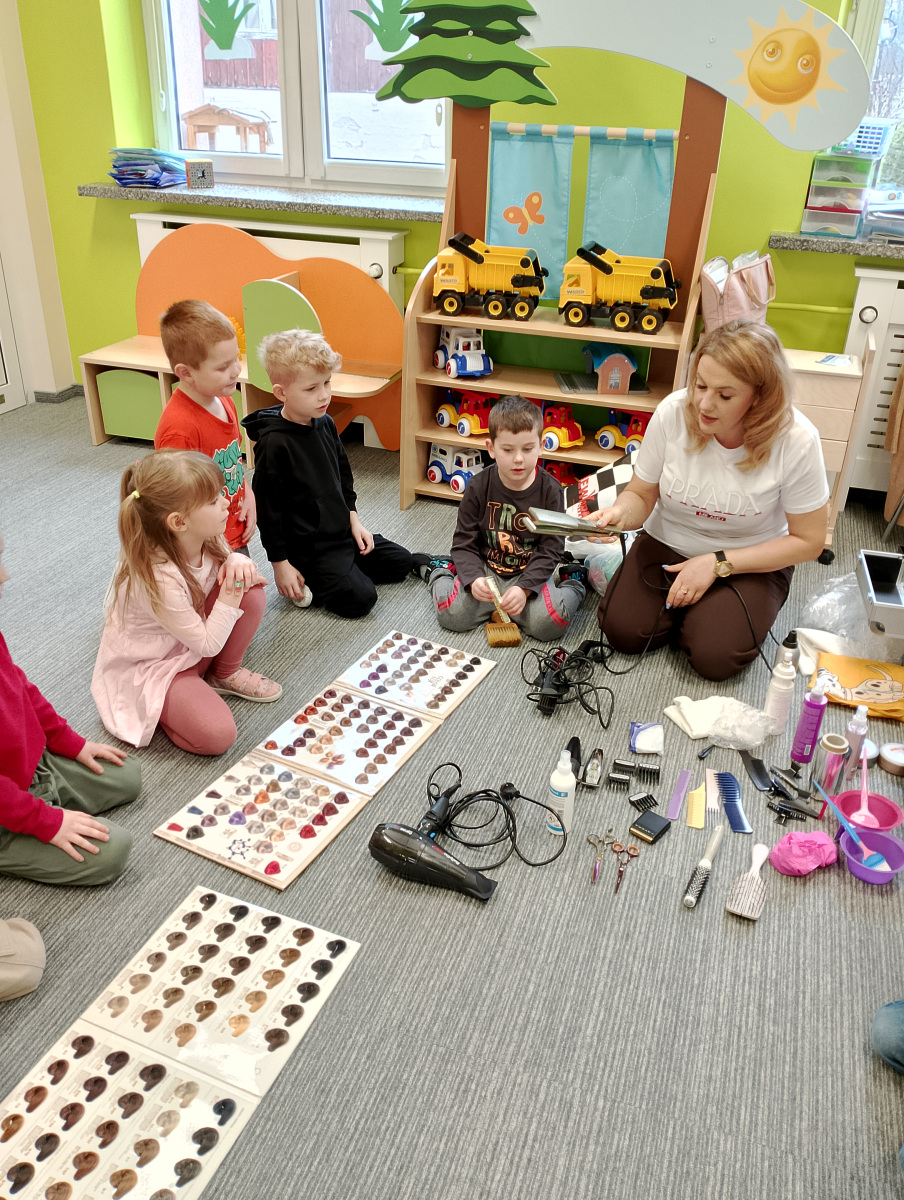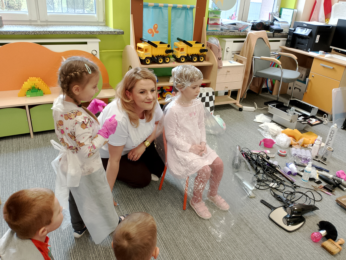 W ramach zajęć z preorientacji zawodowej odwiedził nas wyjątkowy gość – fryzjerka, Pani Monika, mama naszego przedszkolaka Tymusia. Podczas spotkania opowiedziała dzieciom o swojej pracy, przybliżając zawód fryzjera w ciekawy i przystępny sposób. Przedszkolaki miały okazję zobaczyć różnorodne narzędzia fryzjerskie, palety kolorów oraz profesjonalny sprzęt wykorzystywany w salonie. Największą atrakcją okazała się część praktyczna – dzieci z ogromnym zaangażowaniem wcielały się zarówno w rolę fryzjera, tworząc fryzury swoim kolegom i koleżankom, jak i w rolę klienta, oddając się w ręce Pani Moniki i innych dzieci.To były cudowne zajęcia, pełne radości, uśmiechu i nowych doświadczeń. Dzieci były zachwycone i aktywnie uczestniczyły we wszystkich proponowanych aktywnościach.