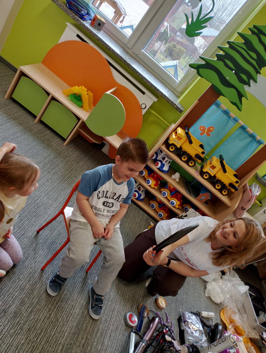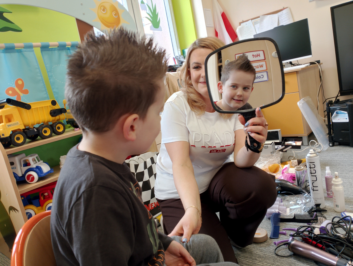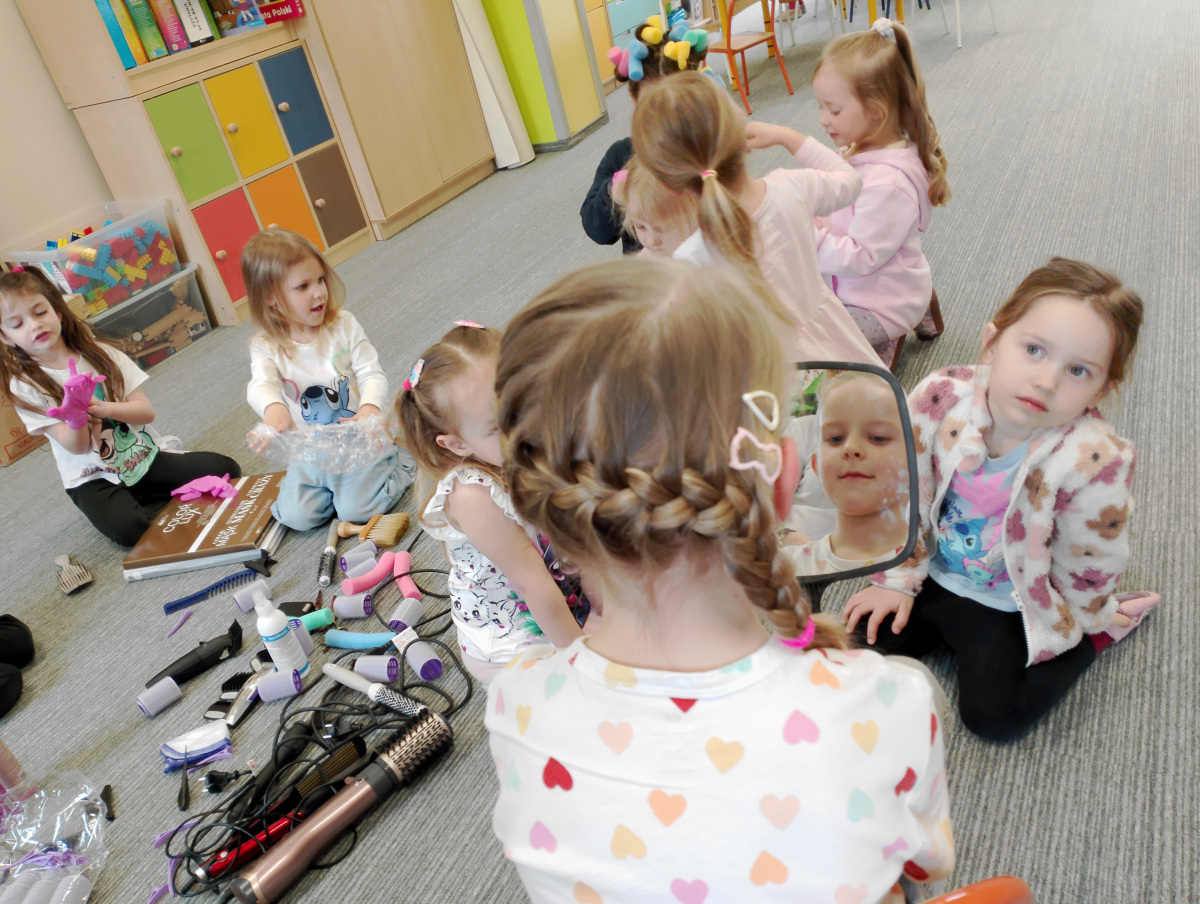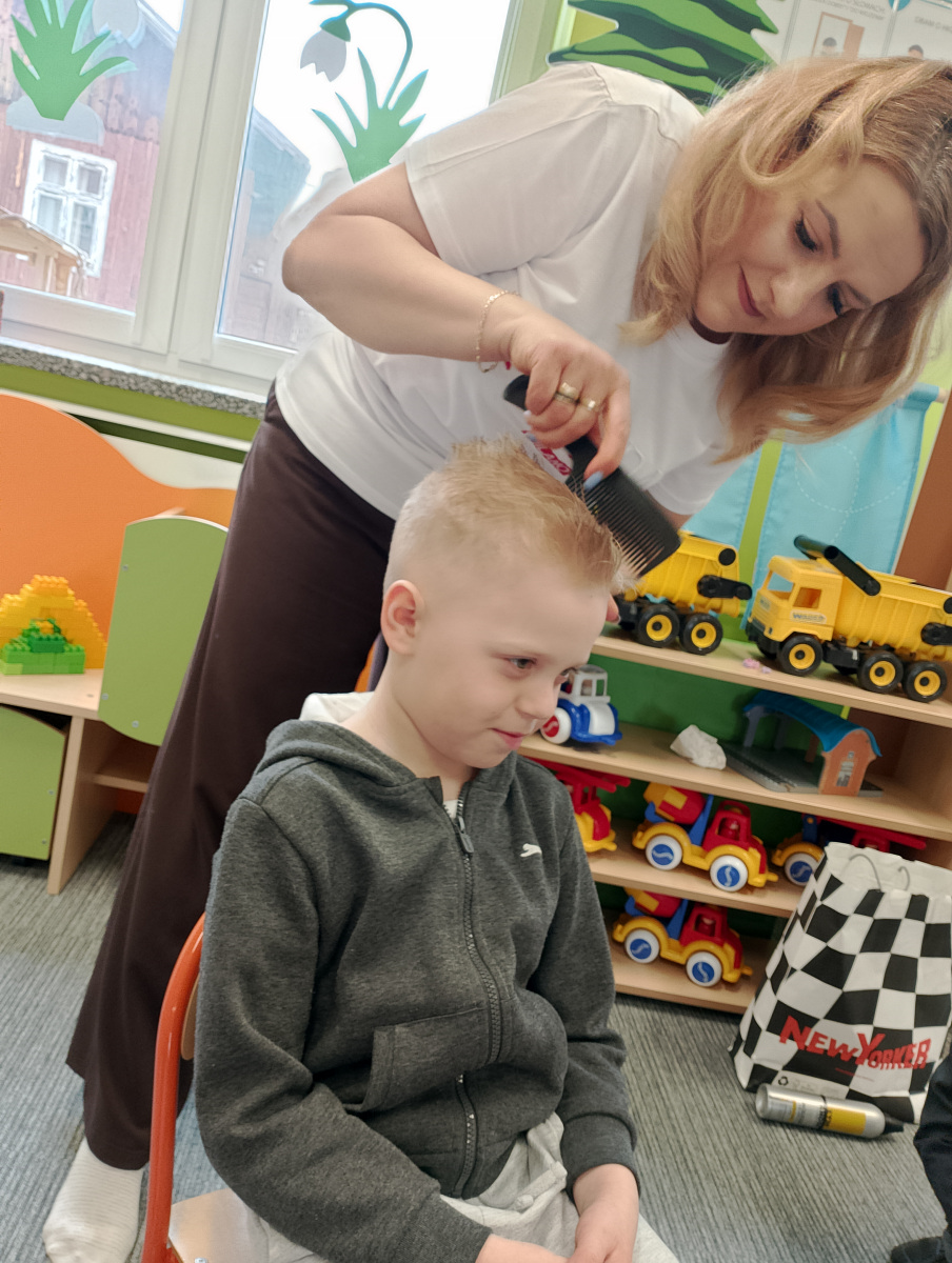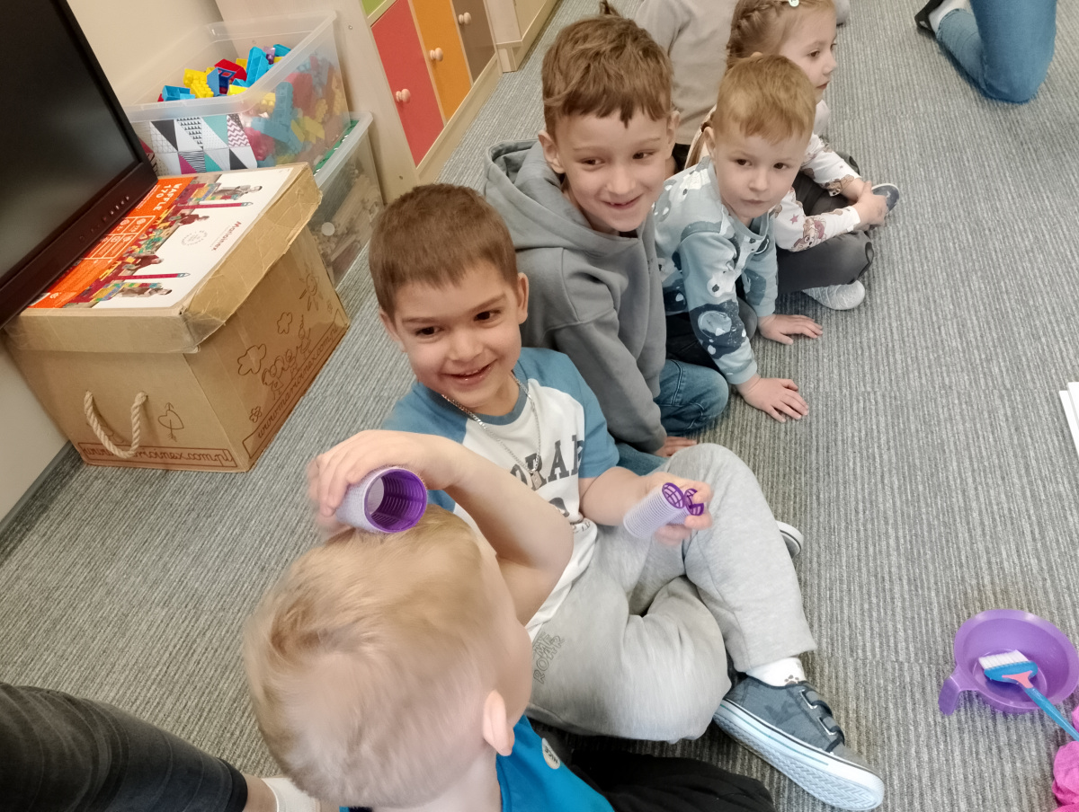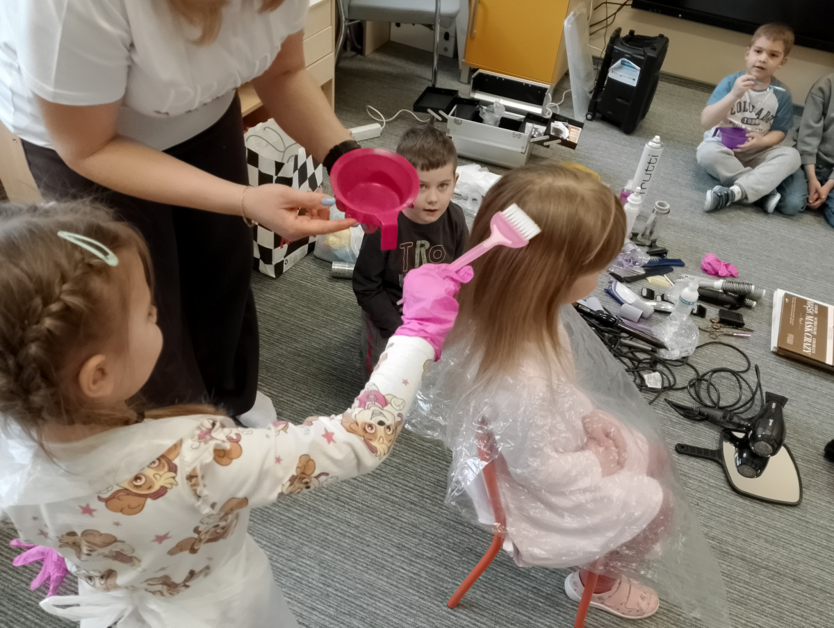 W ramach zajęć z preorientacji zawodowej odwiedził nas wyjątkowy gość – fryzjerka, Pani Monika, mama naszego przedszkolaka Tymusia. Podczas spotkania opowiedziała dzieciom o swojej pracy, przybliżając zawód fryzjera w ciekawy i przystępny sposób. Przedszkolaki miały okazję zobaczyć różnorodne narzędzia fryzjerskie, palety kolorów oraz profesjonalny sprzęt wykorzystywany w salonie. Największą atrakcją okazała się część praktyczna – dzieci z ogromnym zaangażowaniem wcielały się zarówno w rolę fryzjera, tworząc fryzury swoim kolegom i koleżankom, jak i w rolę klienta, oddając się w ręce Pani Moniki i innych dzieci.To były cudowne zajęcia, pełne radości, uśmiechu i nowych doświadczeń. Dzieci były zachwycone i aktywnie uczestniczyły we wszystkich proponowanych aktywnościach.
