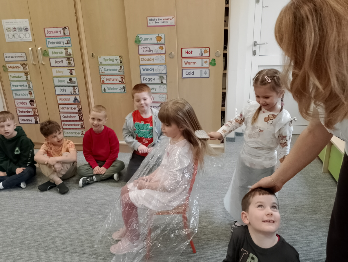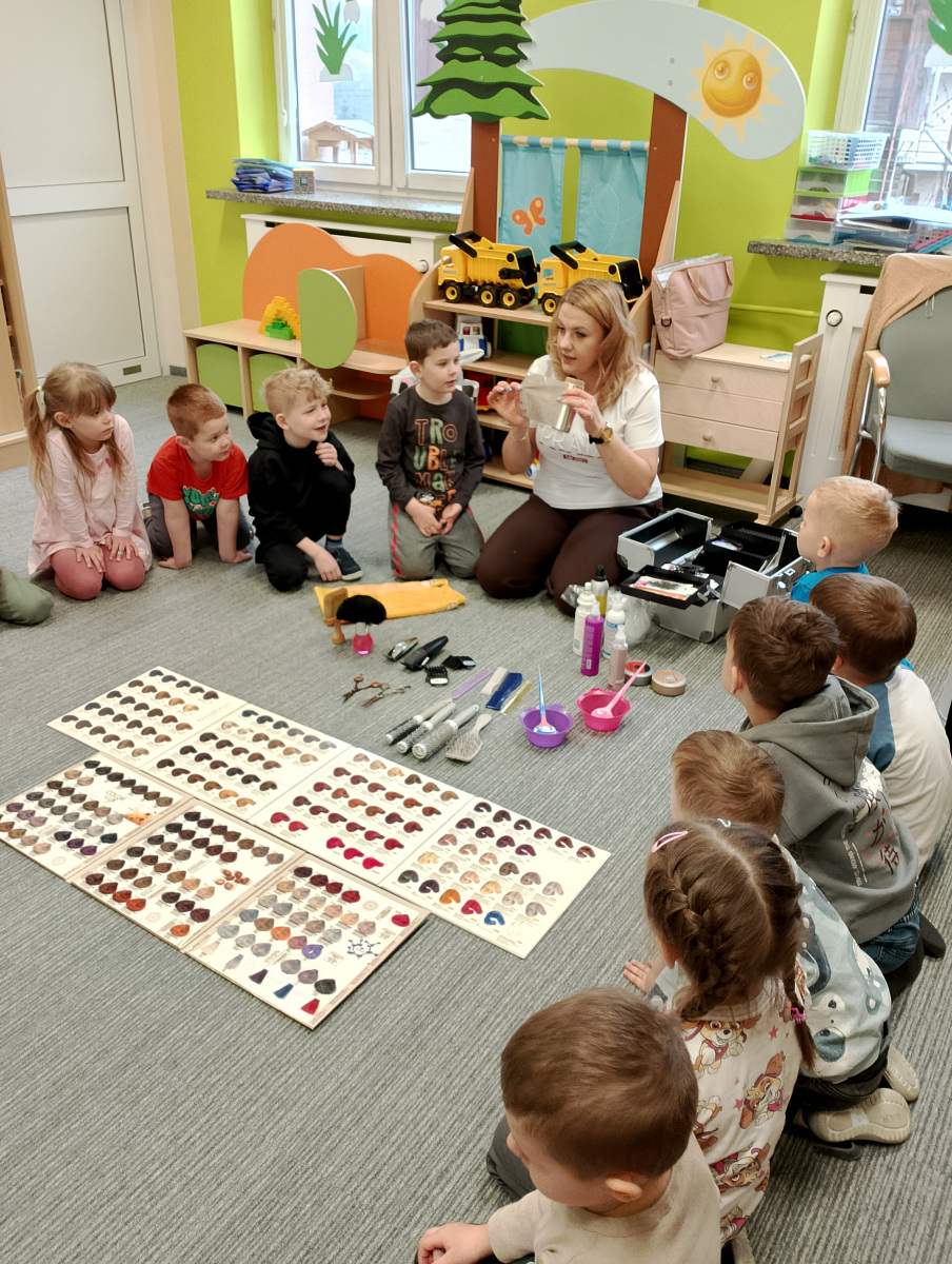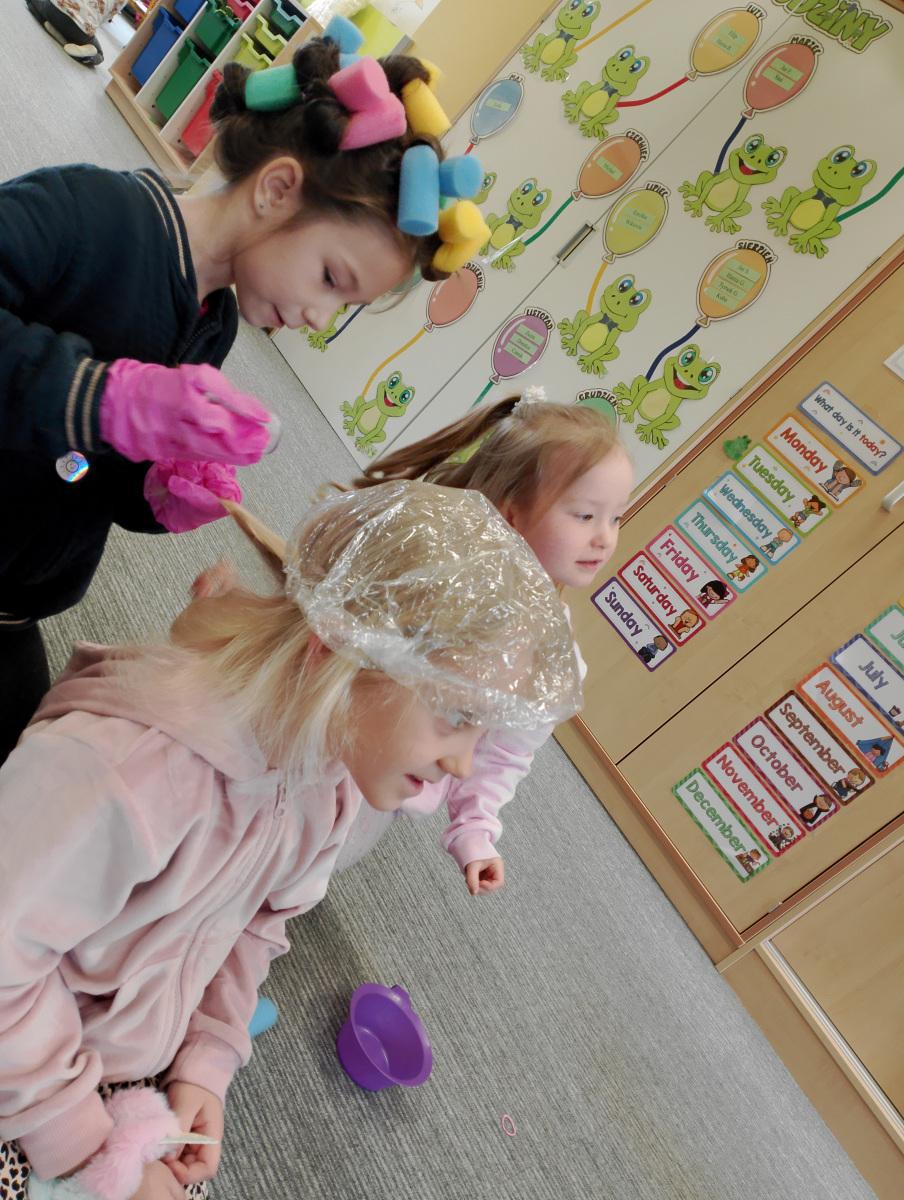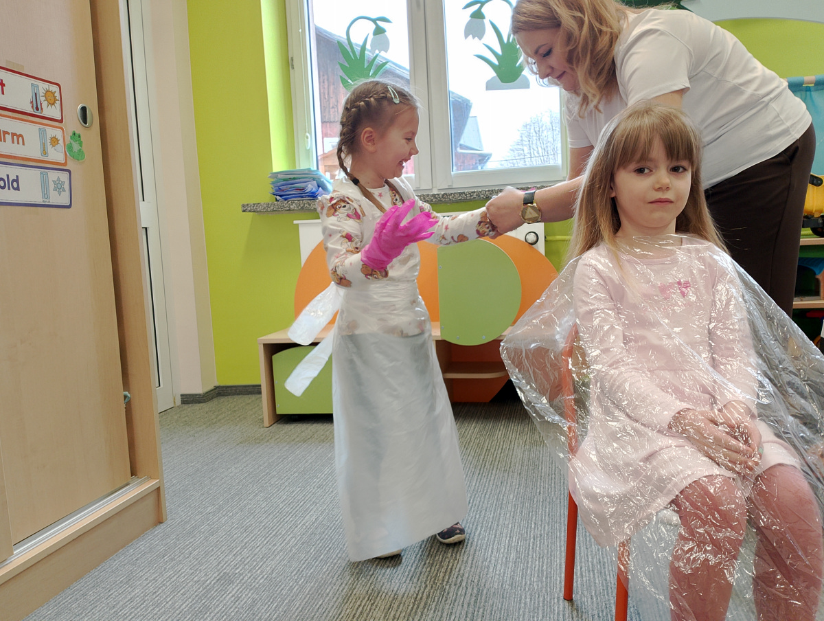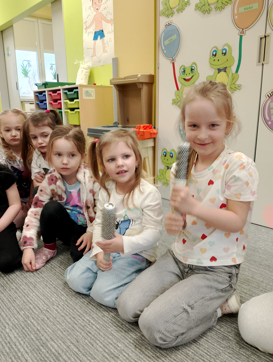 W ramach zajęć z preorientacji zawodowej odwiedził nas wyjątkowy gość – fryzjerka, Pani Monika, mama naszego przedszkolaka Tymusia. Podczas spotkania opowiedziała dzieciom o swojej pracy, przybliżając zawód fryzjera w ciekawy i przystępny sposób. Przedszkolaki miały okazję zobaczyć różnorodne narzędzia fryzjerskie, palety kolorów oraz profesjonalny sprzęt wykorzystywany w salonie. Największą atrakcją okazała się część praktyczna – dzieci z ogromnym zaangażowaniem wcielały się zarówno w rolę fryzjera, tworząc fryzury swoim kolegom i koleżankom, jak i w rolę klienta, oddając się w ręce Pani Moniki i innych dzieci.To były cudowne zajęcia, pełne radości, uśmiechu i nowych doświadczeń. Dzieci były zachwycone i aktywnie uczestniczyły we wszystkich proponowanych aktywnościach.
