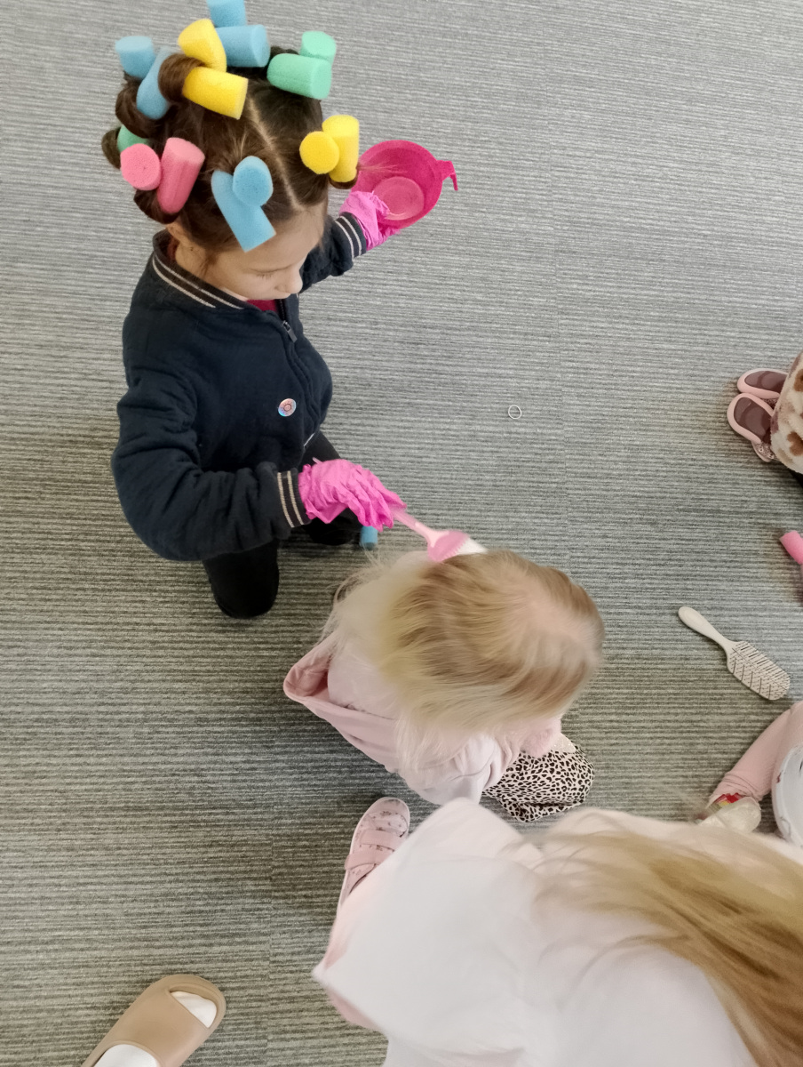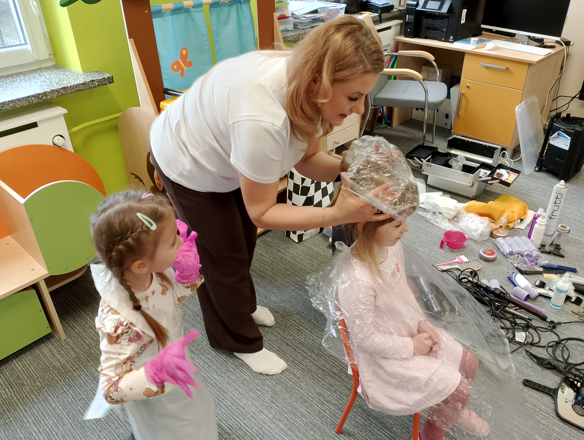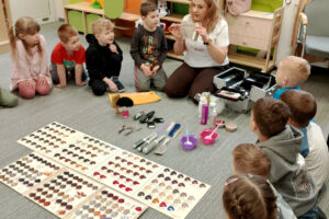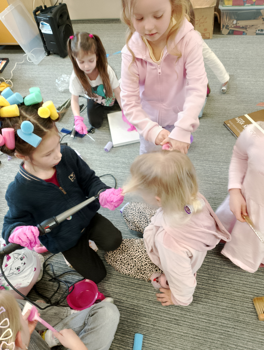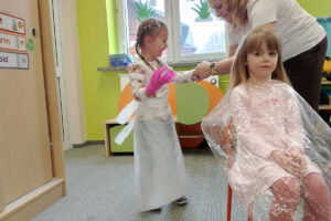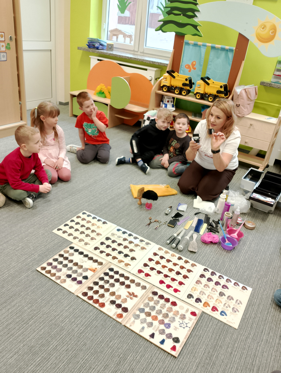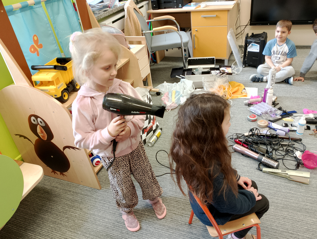 W ramach zajęć z preorientacji zawodowej odwiedził nas wyjątkowy gość – fryzjerka, Pani Monika, mama naszego przedszkolaka Tymusia. Podczas spotkania opowiedziała dzieciom o swojej pracy, przybliżając zawód fryzjera w ciekawy i przystępny sposób. Przedszkolaki miały okazję zobaczyć różnorodne narzędzia fryzjerskie, palety kolorów oraz profesjonalny sprzęt wykorzystywany w salonie. Największą atrakcją okazała się część praktyczna – dzieci z ogromnym zaangażowaniem wcielały się zarówno w rolę fryzjera, tworząc fryzury swoim kolegom i koleżankom, jak i w rolę klienta, oddając się w ręce Pani Moniki i innych dzieci.To były cudowne zajęcia, pełne radości, uśmiechu i nowych doświadczeń. Dzieci były zachwycone i aktywnie uczestniczyły we wszystkich proponowanych aktywnościach.