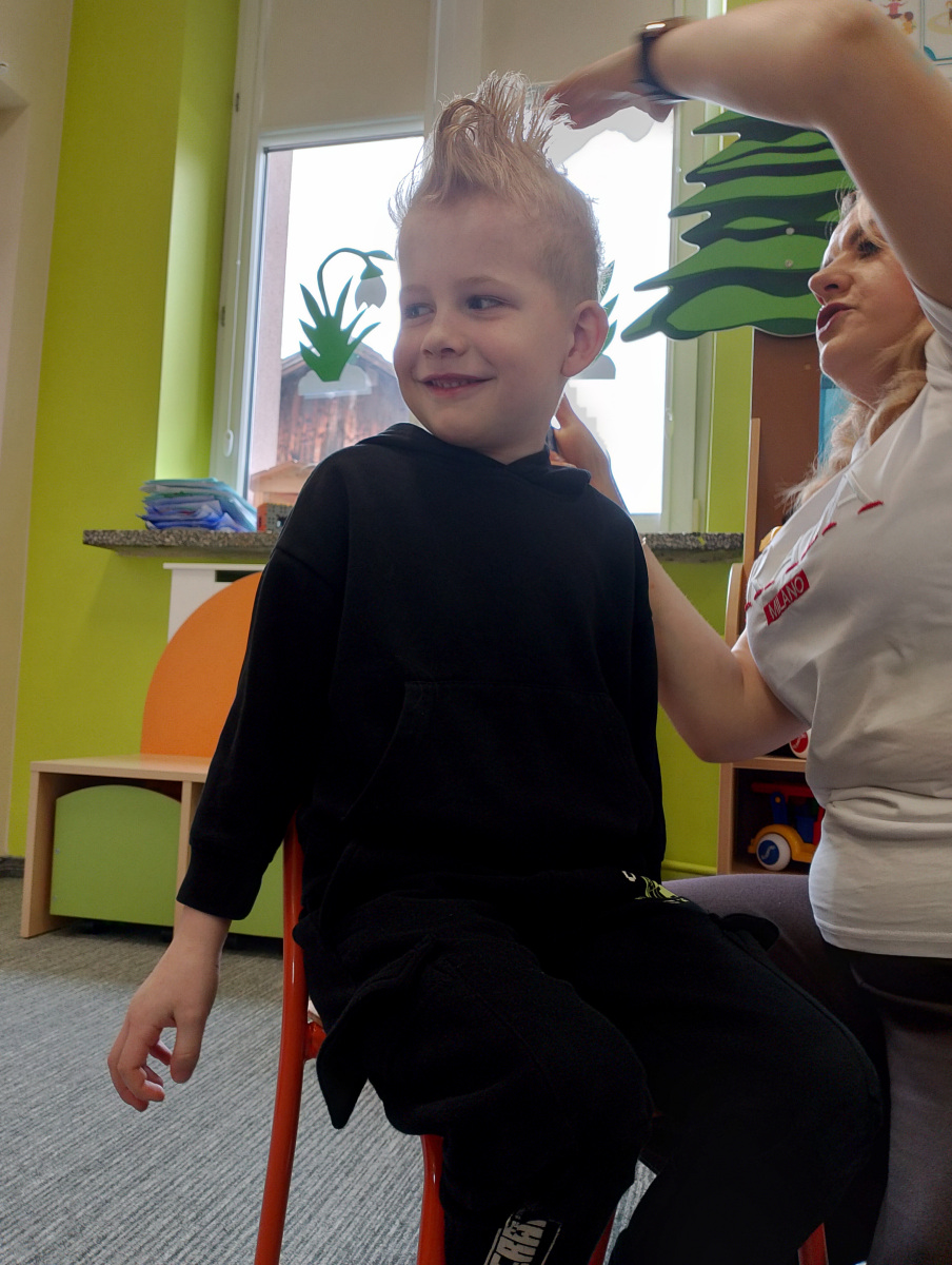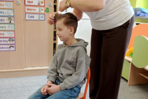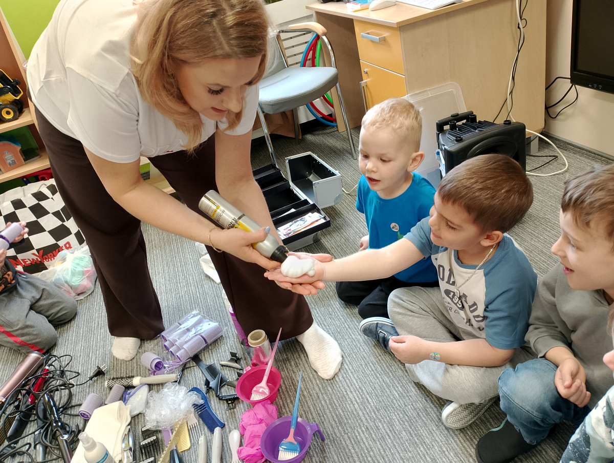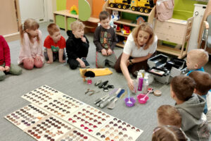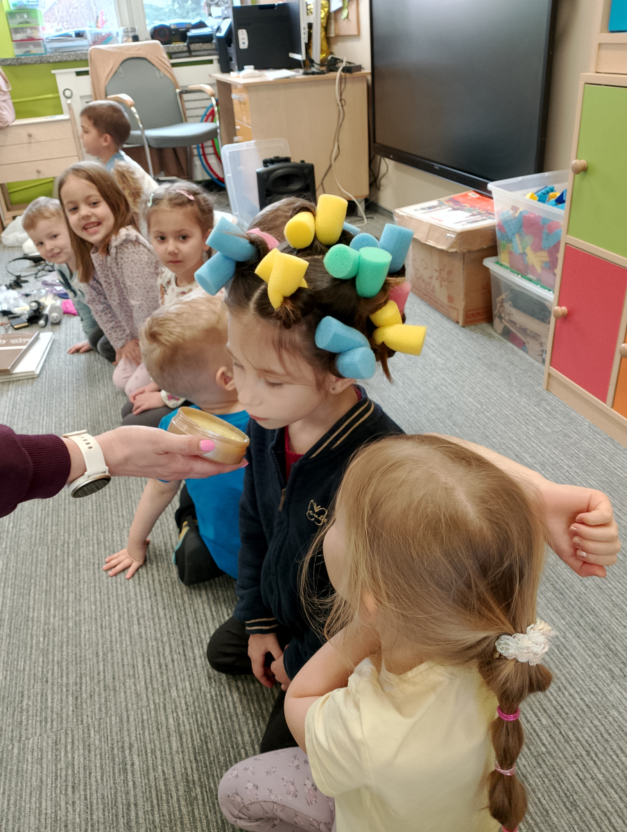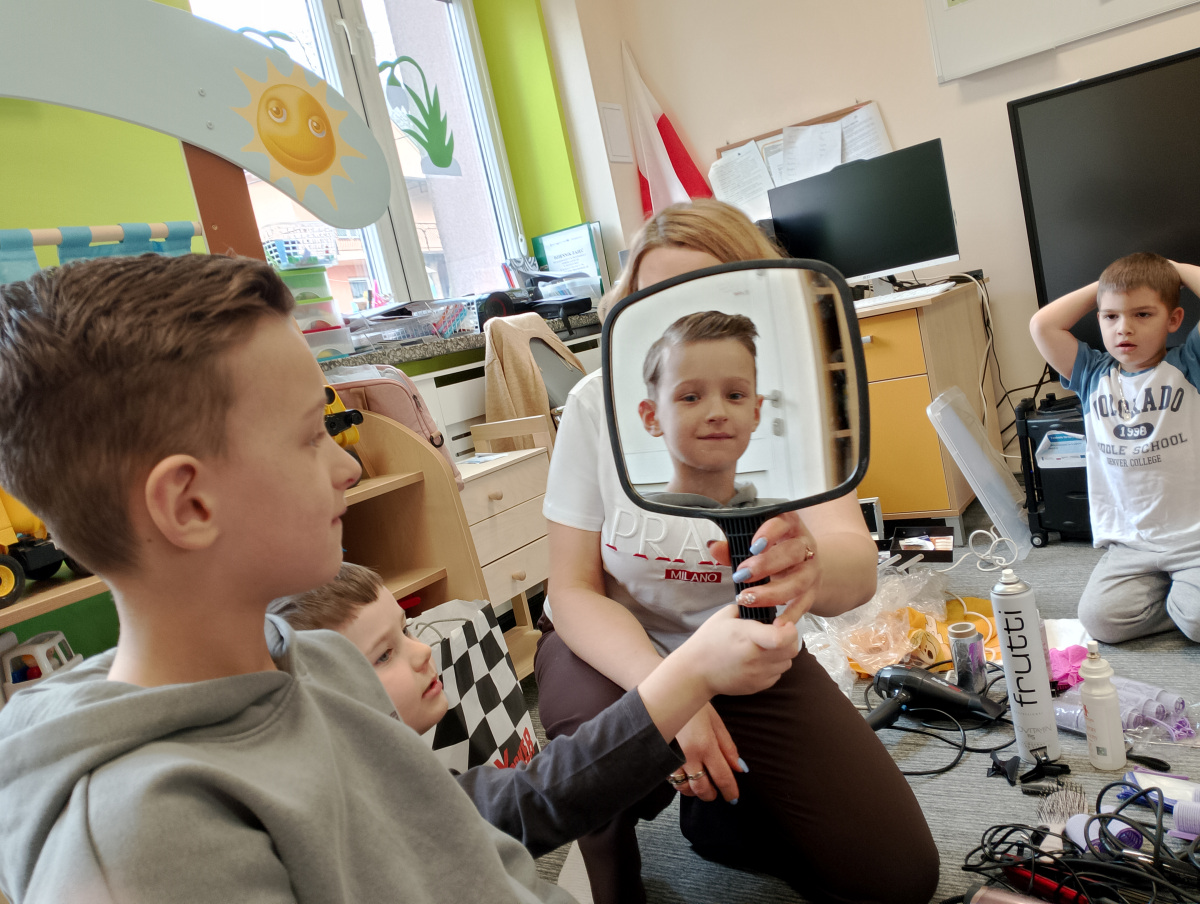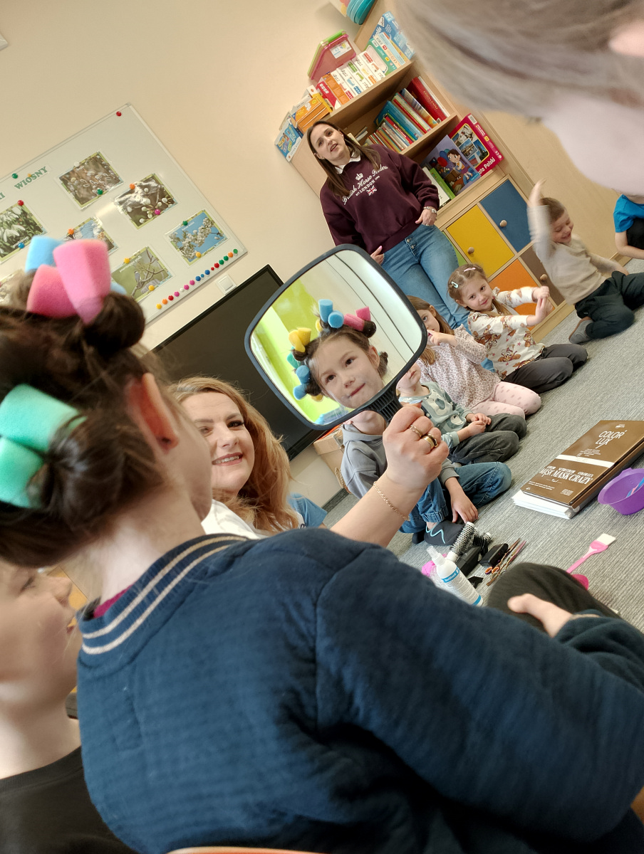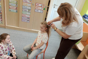 W ramach zajęć z preorientacji zawodowej odwiedził nas wyjątkowy gość – fryzjerka, Pani Monika, mama naszego przedszkolaka Tymusia. Podczas spotkania opowiedziała dzieciom o swojej pracy, przybliżając zawód fryzjera w ciekawy i przystępny sposób. Przedszkolaki miały okazję zobaczyć różnorodne narzędzia fryzjerskie, palety kolorów oraz profesjonalny sprzęt wykorzystywany w salonie. Największą atrakcją okazała się część praktyczna – dzieci z ogromnym zaangażowaniem wcielały się zarówno w rolę fryzjera, tworząc fryzury swoim kolegom i koleżankom, jak i w rolę klienta, oddając się w ręce Pani Moniki i innych dzieci.To były cudowne zajęcia, pełne radości, uśmiechu i nowych doświadczeń. Dzieci były zachwycone i aktywnie uczestniczyły we wszystkich proponowanych aktywnościach.