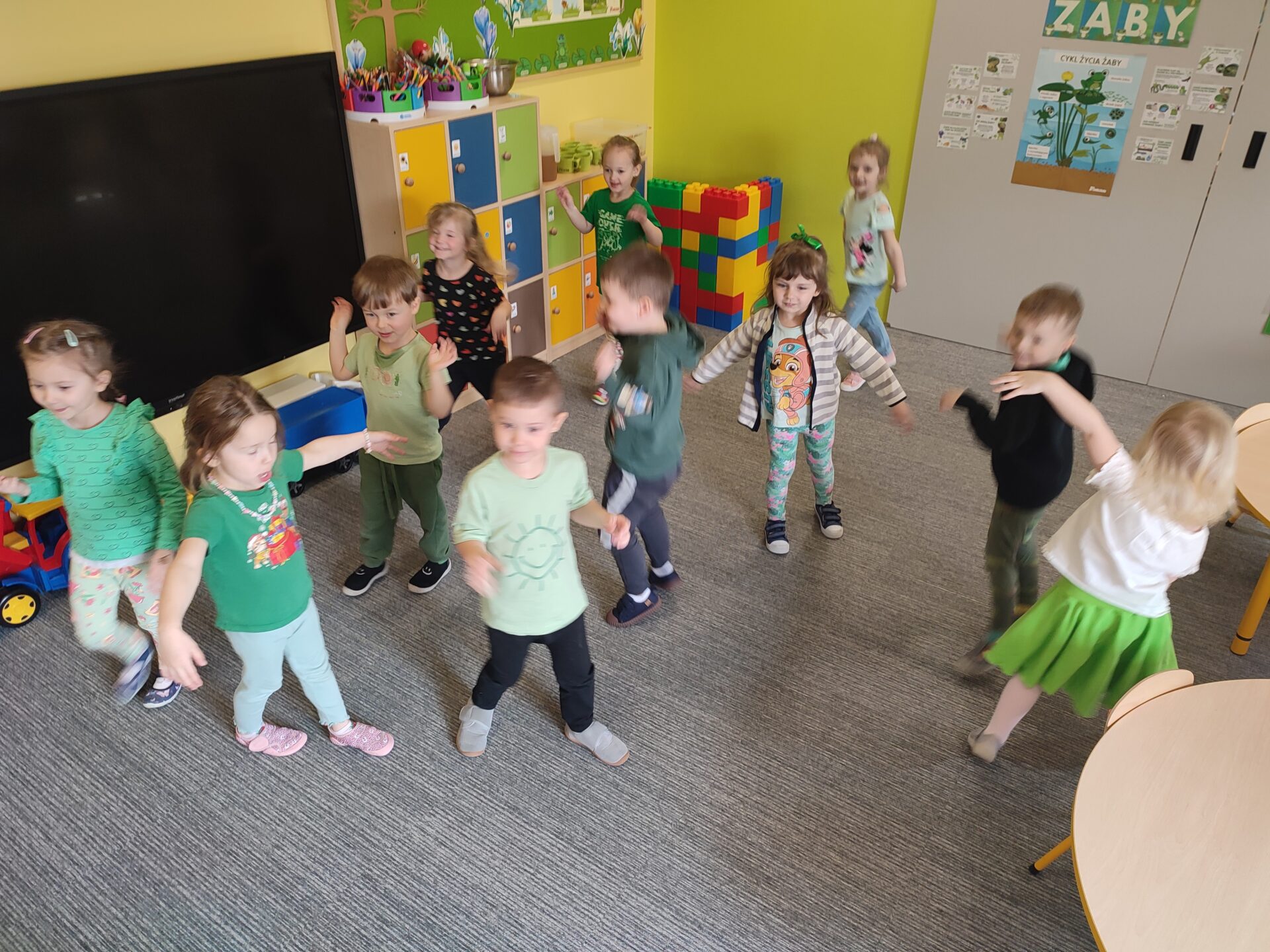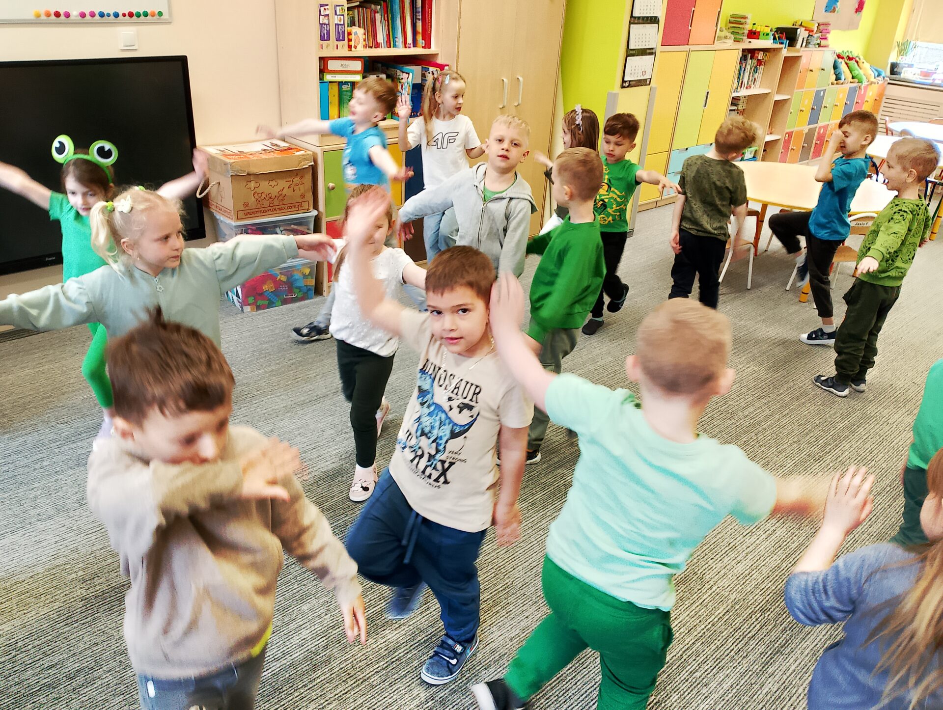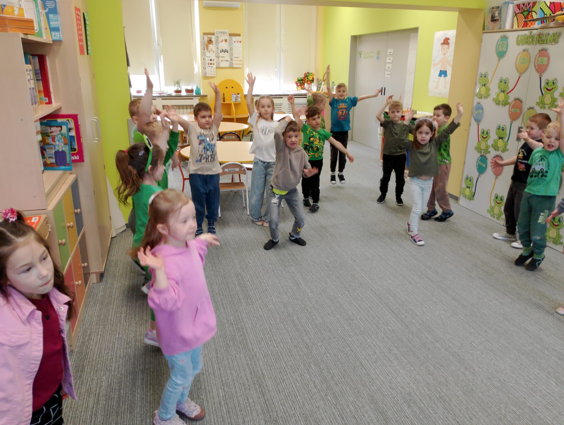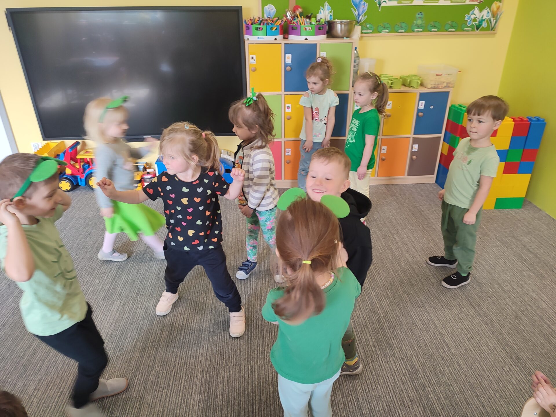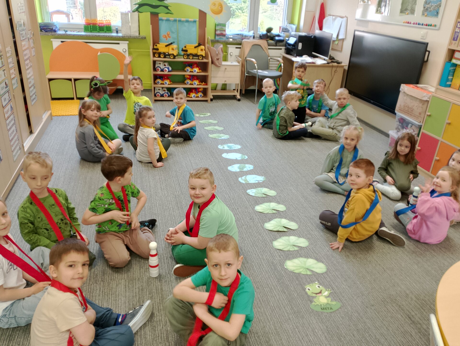 W naszym przedszkolu odbył się pełen radości i aktywności Dzień Żaby. Tego dnia dzieci przyszły ubrane w zielone stroje, dzięki czemu od samego rana panowała wyjątkowa, „żabia” atmosfera. Podczas zajęć przedszkolaki poznały wiele ciekawostek na temat życia żab – dowiedziały się, gdzie żyją, czym się odżywiają oraz jak wygląda ich rozwój. Dzieci uczyły się także określać kolejne etapy cyklu rozwoju żaby, co było nie tylko ciekawe, ale i bardzo pouczające. Nie zabrakło ruchu i dobrej zabawy! Dzieci chętnie brały udział w zabawach ruchowych takich jak „Bocian i żaby” oraz „Żaby i muchy”, które dostarczyły mnóstwo śmiechu i pozytywnej energii. Dużym zainteresowaniem cieszyła się gra planszowa XXL „Żabia”, podczas której „Skaczące Żabki” pracowały w grupach, ucząc się współpracy i zdrowej rywalizacji. Przedszkolaki ćwiczyły również pamięć, biorąc udział w grze memory o tematyce żabiej. Starsze dzieci rozwijały również swoje umiejętności matematyczne podczas „żabiej matematyki” – dodawały i odejmowały, a także porównywały liczebność zbiorów, określając, w którym jest więcej żab, używając znaków większości i mniejszości.