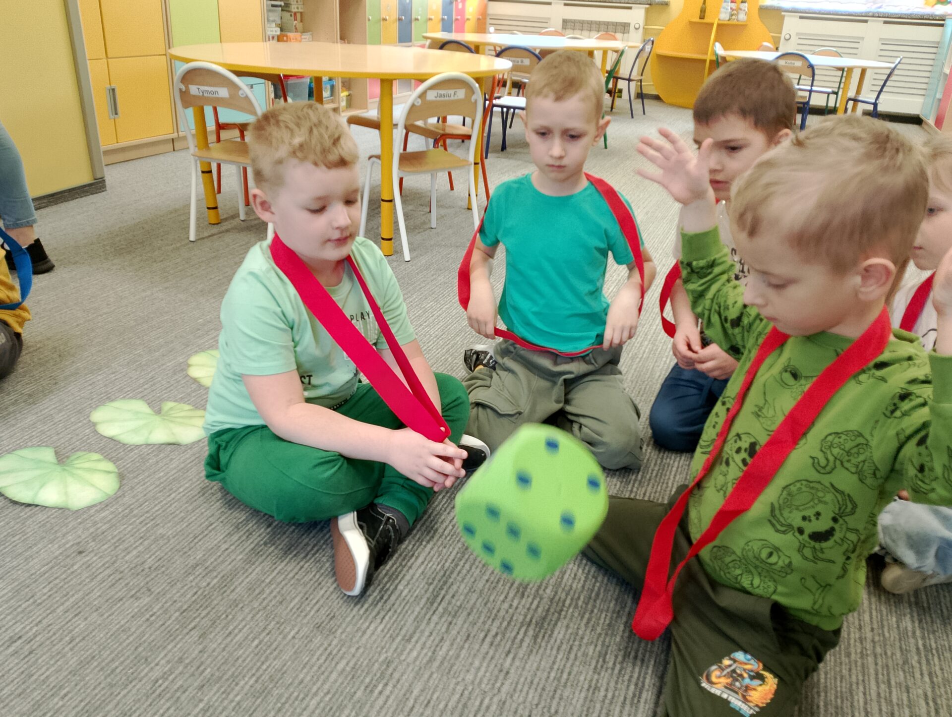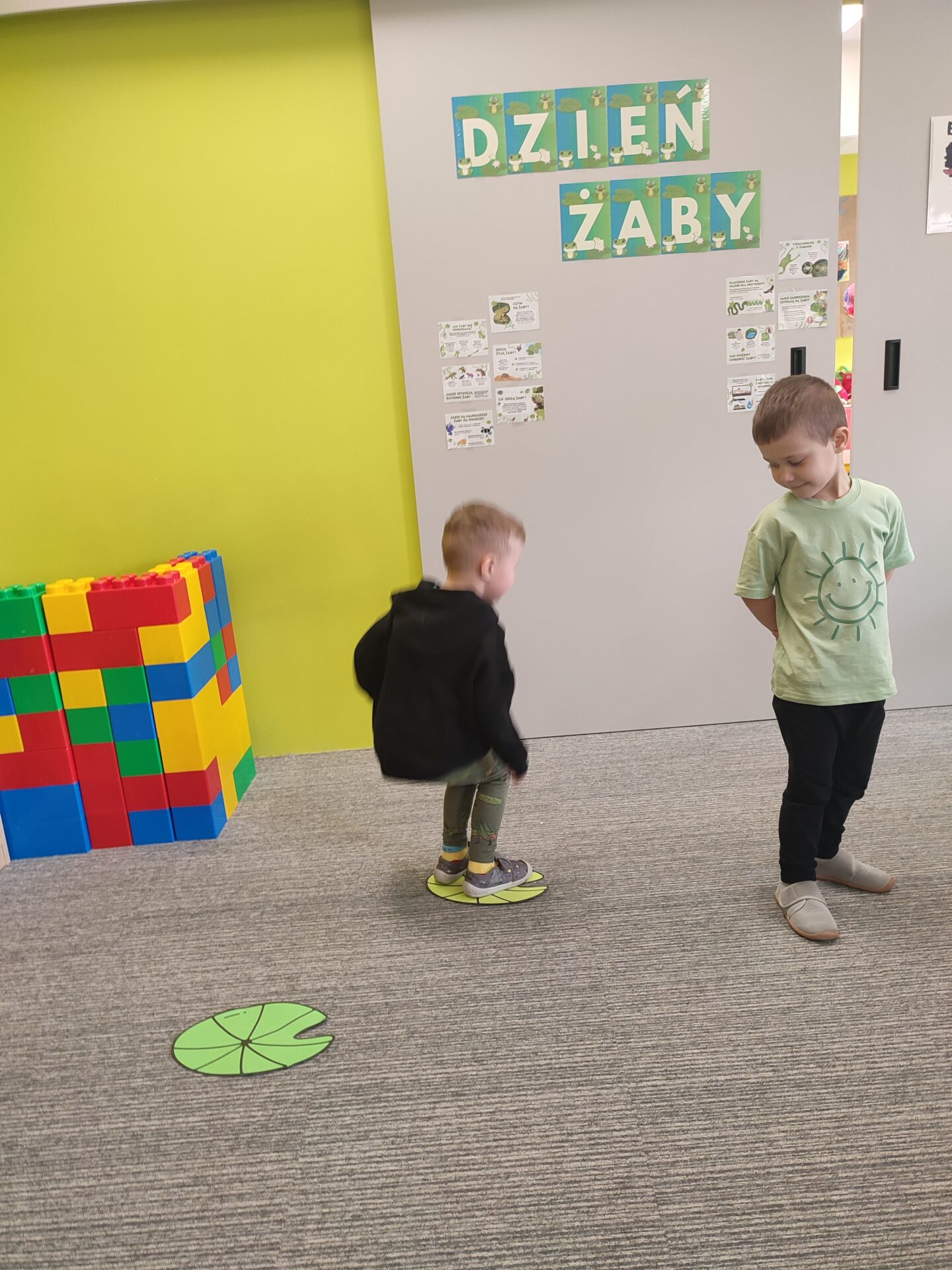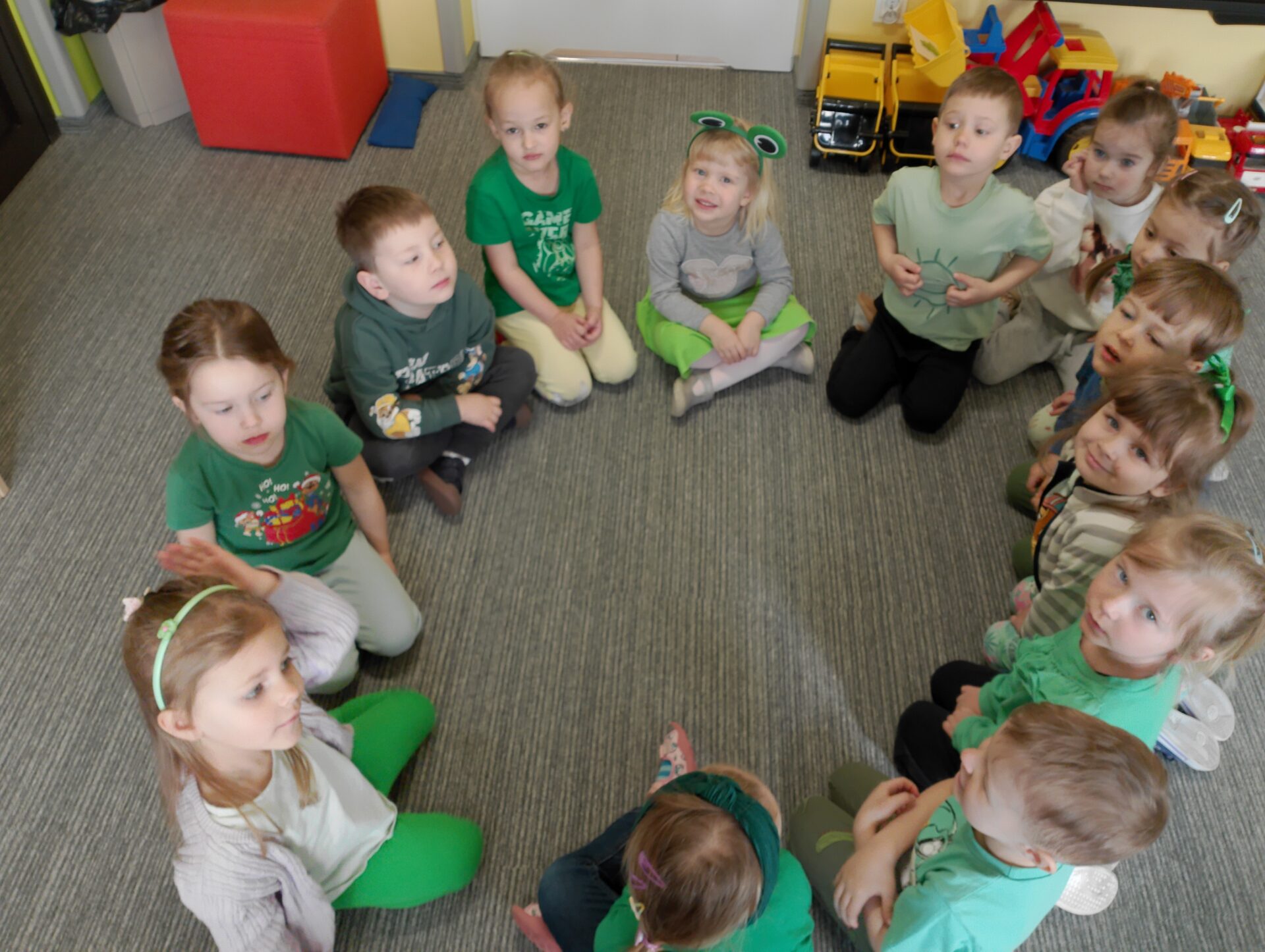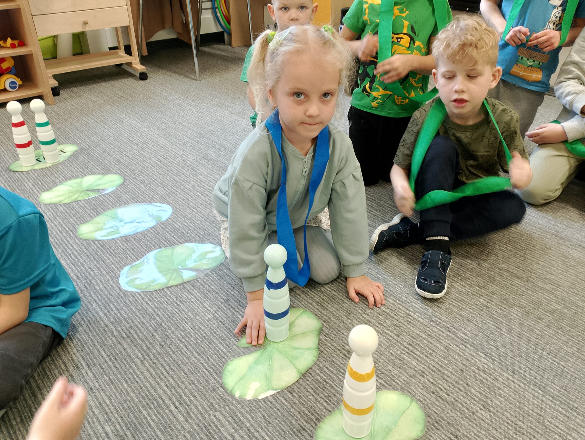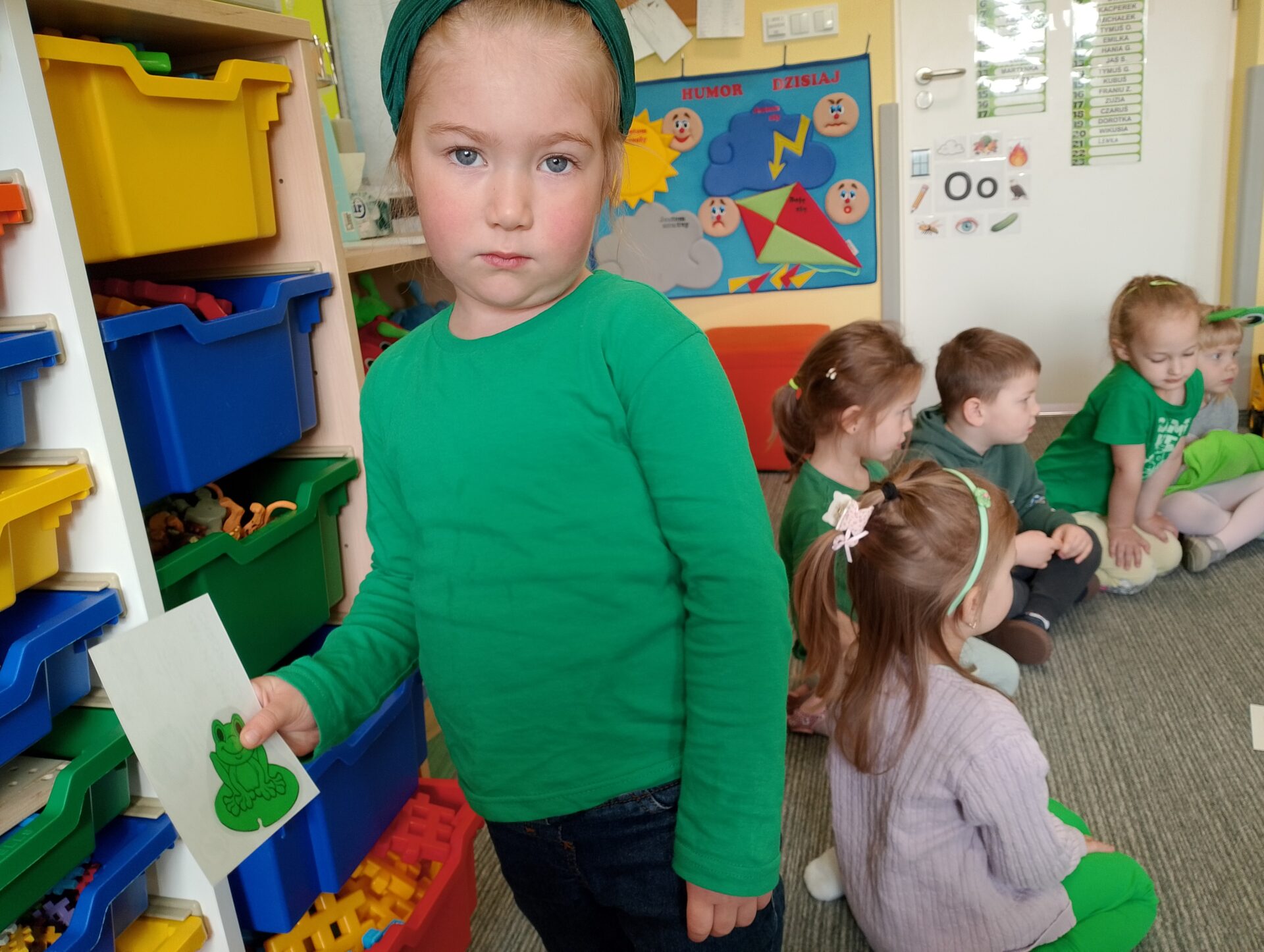 W naszym przedszkolu odbył się pełen radości i aktywności Dzień Żaby. Tego dnia dzieci przyszły ubrane w zielone stroje, dzięki czemu od samego rana panowała wyjątkowa, „żabia” atmosfera. Podczas zajęć przedszkolaki poznały wiele ciekawostek na temat życia żab – dowiedziały się, gdzie żyją, czym się odżywiają oraz jak wygląda ich rozwój. Dzieci uczyły się także określać kolejne etapy cyklu rozwoju żaby, co było nie tylko ciekawe, ale i bardzo pouczające. Nie zabrakło ruchu i dobrej zabawy! Dzieci chętnie brały udział w zabawach ruchowych takich jak „Bocian i żaby” oraz „Żaby i muchy”, które dostarczyły mnóstwo śmiechu i pozytywnej energii. Dużym zainteresowaniem cieszyła się gra planszowa XXL „Żabia”, podczas której „Skaczące Żabki” pracowały w grupach, ucząc się współpracy i zdrowej rywalizacji. Przedszkolaki ćwiczyły również pamięć, biorąc udział w grze memory o tematyce żabiej. Starsze dzieci rozwijały również swoje umiejętności matematyczne podczas „żabiej matematyki” – dodawały i odejmowały, a także porównywały liczebność zbiorów, określając, w którym jest więcej żab, używając znaków większości i mniejszości.