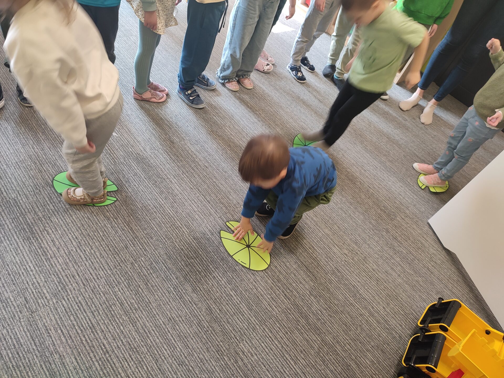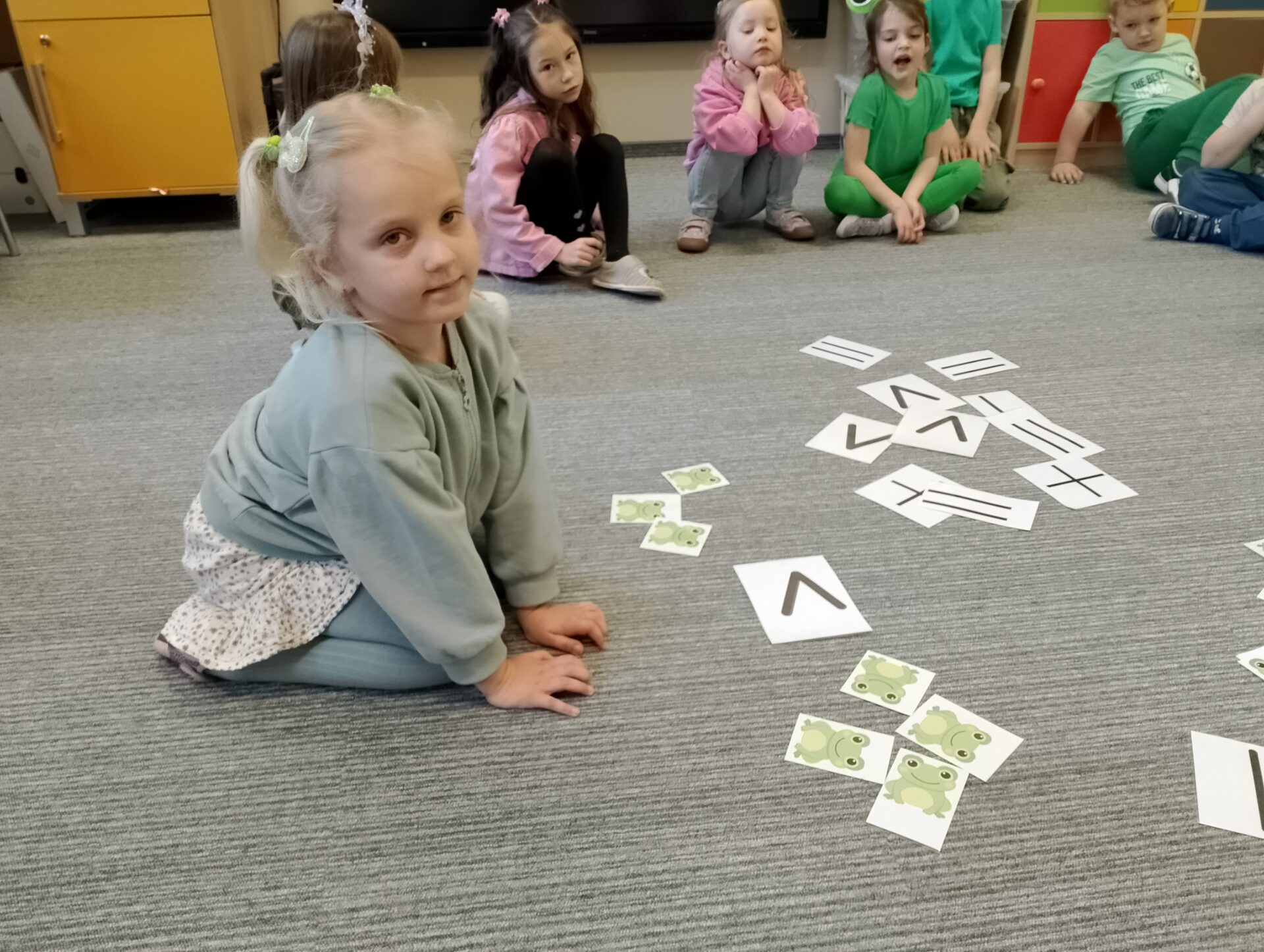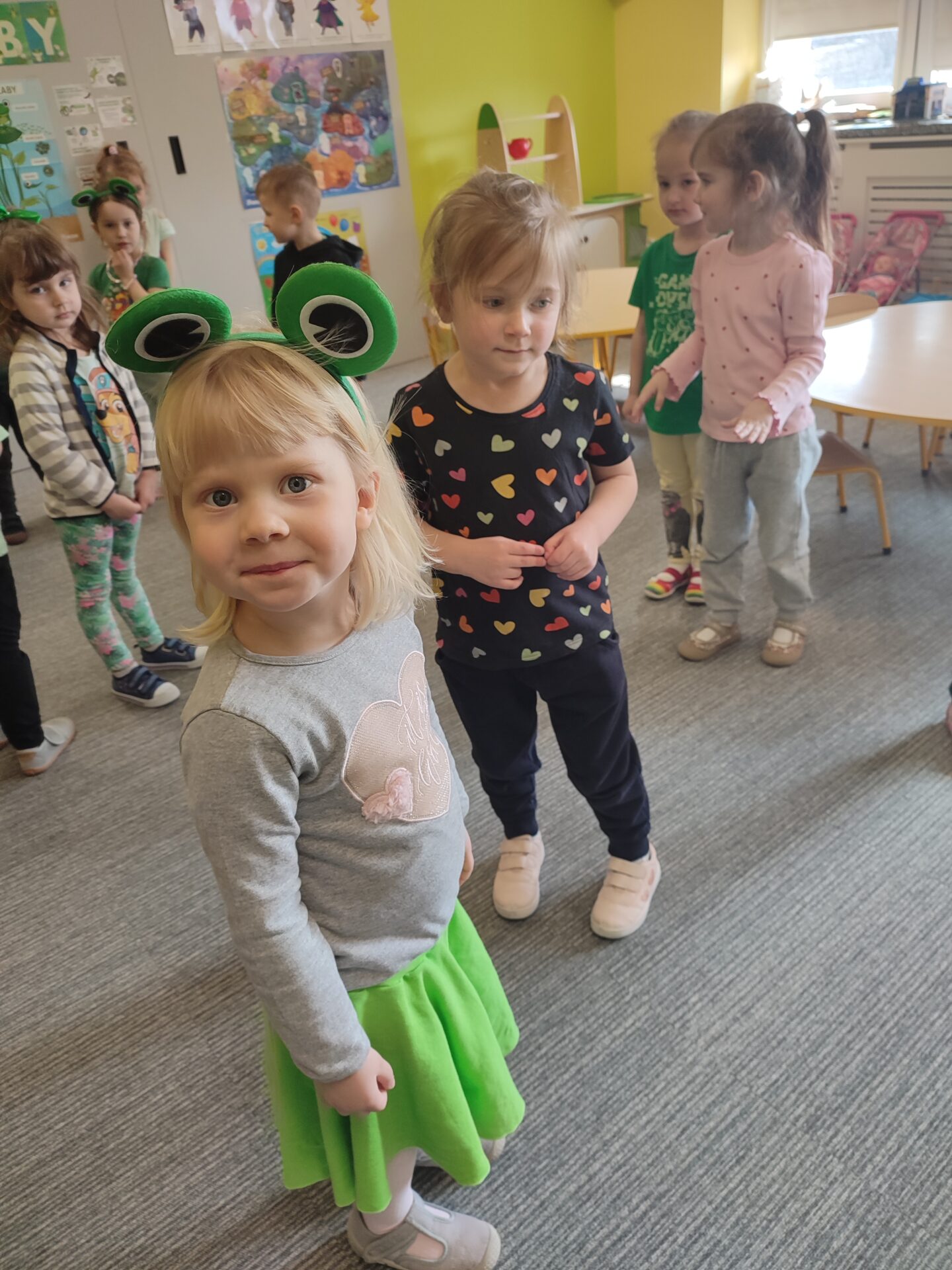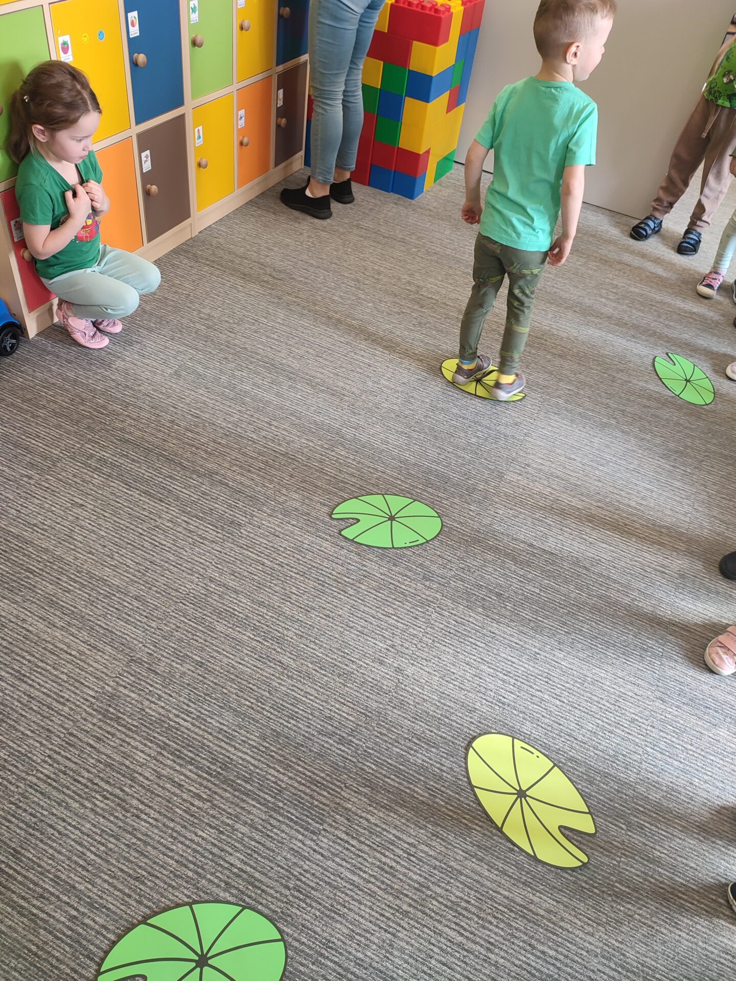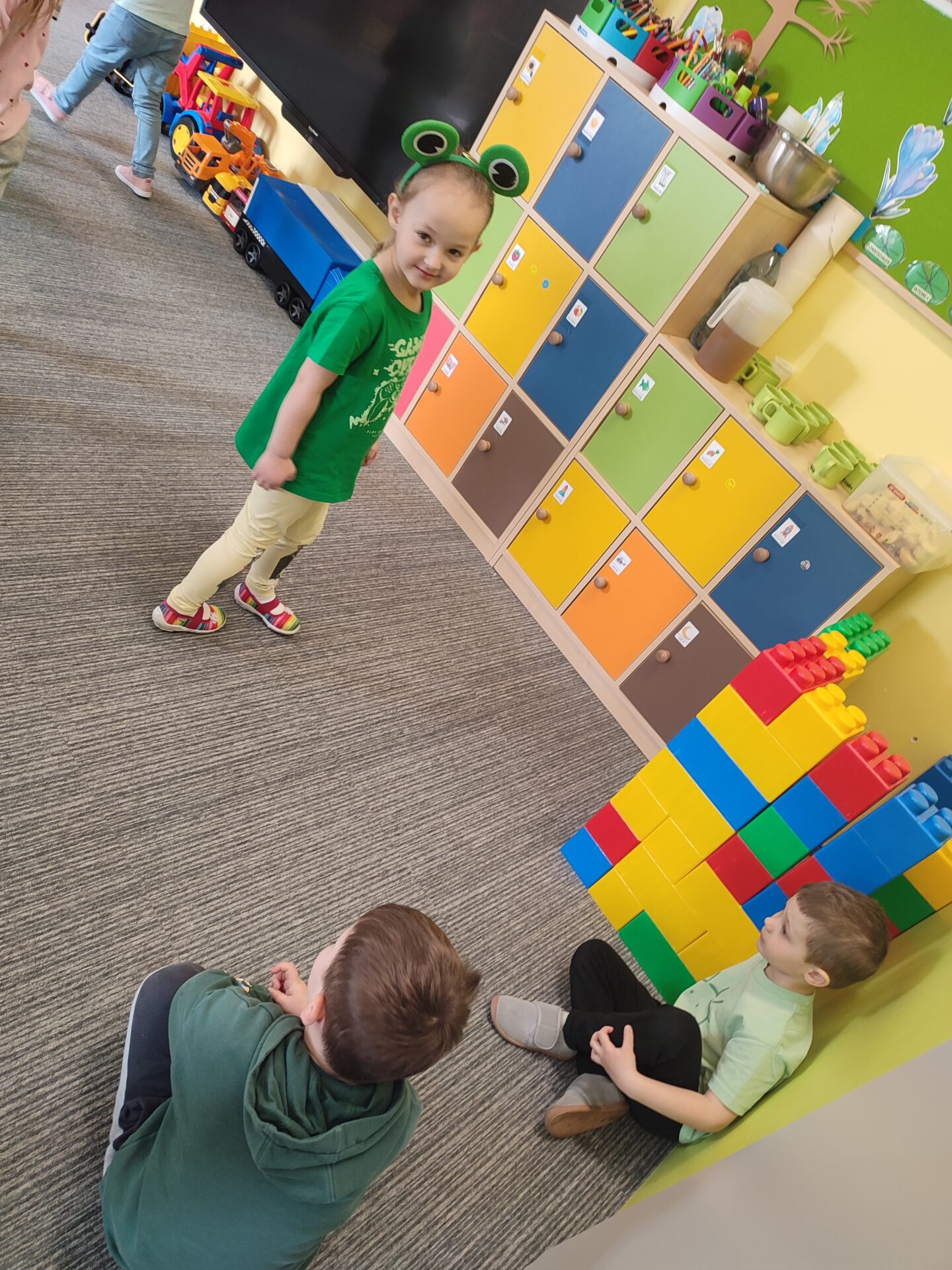 W naszym przedszkolu odbył się pełen radości i aktywności Dzień Żaby. Tego dnia dzieci przyszły ubrane w zielone stroje, dzięki czemu od samego rana panowała wyjątkowa, „żabia” atmosfera. Podczas zajęć przedszkolaki poznały wiele ciekawostek na temat życia żab – dowiedziały się, gdzie żyją, czym się odżywiają oraz jak wygląda ich rozwój. Dzieci uczyły się także określać kolejne etapy cyklu rozwoju żaby, co było nie tylko ciekawe, ale i bardzo pouczające. Nie zabrakło ruchu i dobrej zabawy! Dzieci chętnie brały udział w zabawach ruchowych takich jak „Bocian i żaby” oraz „Żaby i muchy”, które dostarczyły mnóstwo śmiechu i pozytywnej energii. Dużym zainteresowaniem cieszyła się gra planszowa XXL „Żabia”, podczas której „Skaczące Żabki” pracowały w grupach, ucząc się współpracy i zdrowej rywalizacji. Przedszkolaki ćwiczyły również pamięć, biorąc udział w grze memory o tematyce żabiej. Starsze dzieci rozwijały również swoje umiejętności matematyczne podczas „żabiej matematyki” – dodawały i odejmowały, a także porównywały liczebność zbiorów, określając, w którym jest więcej żab, używając znaków większości i mniejszości.