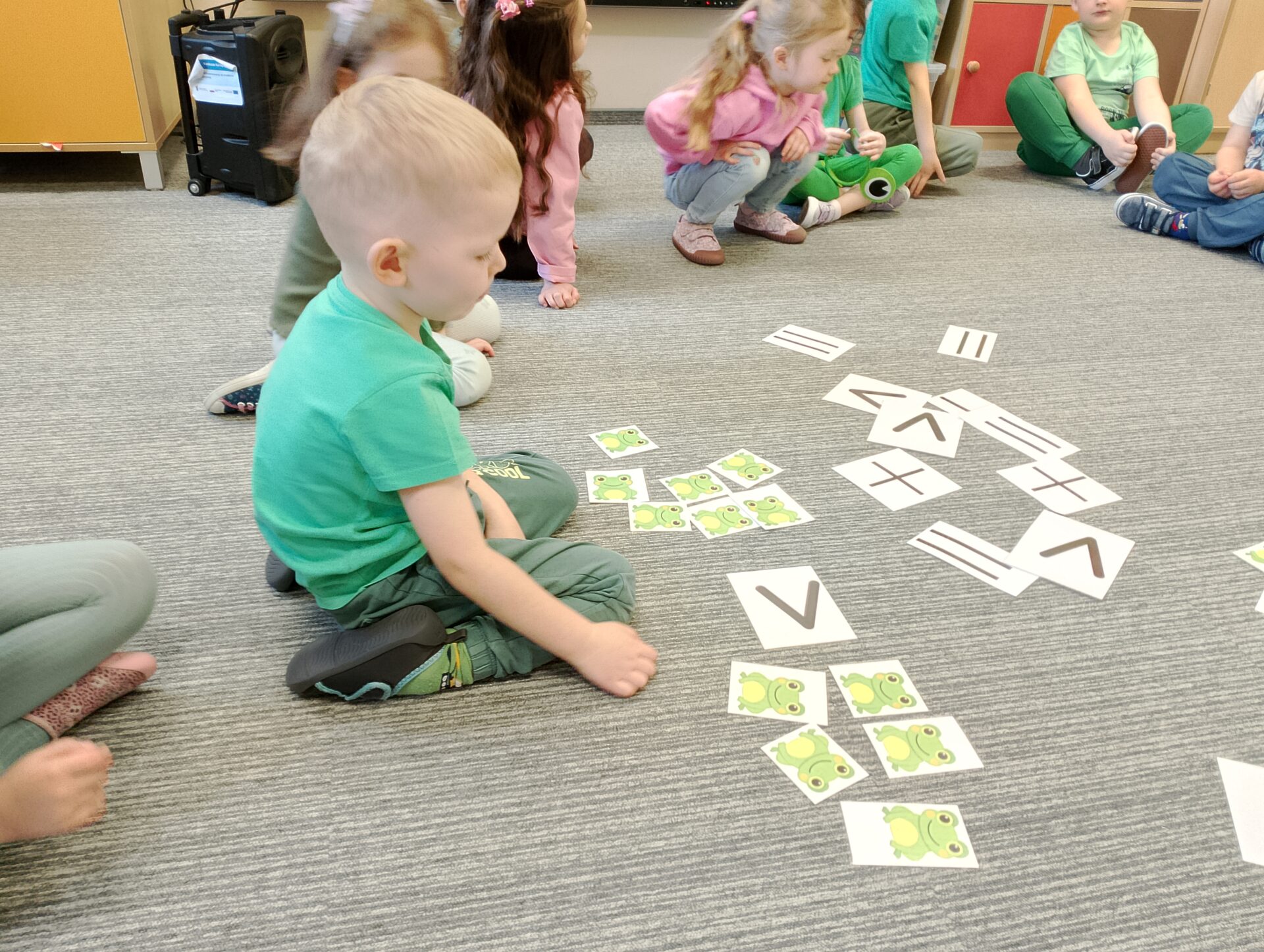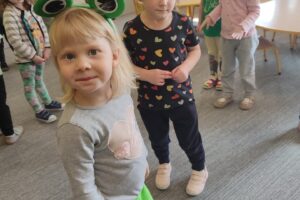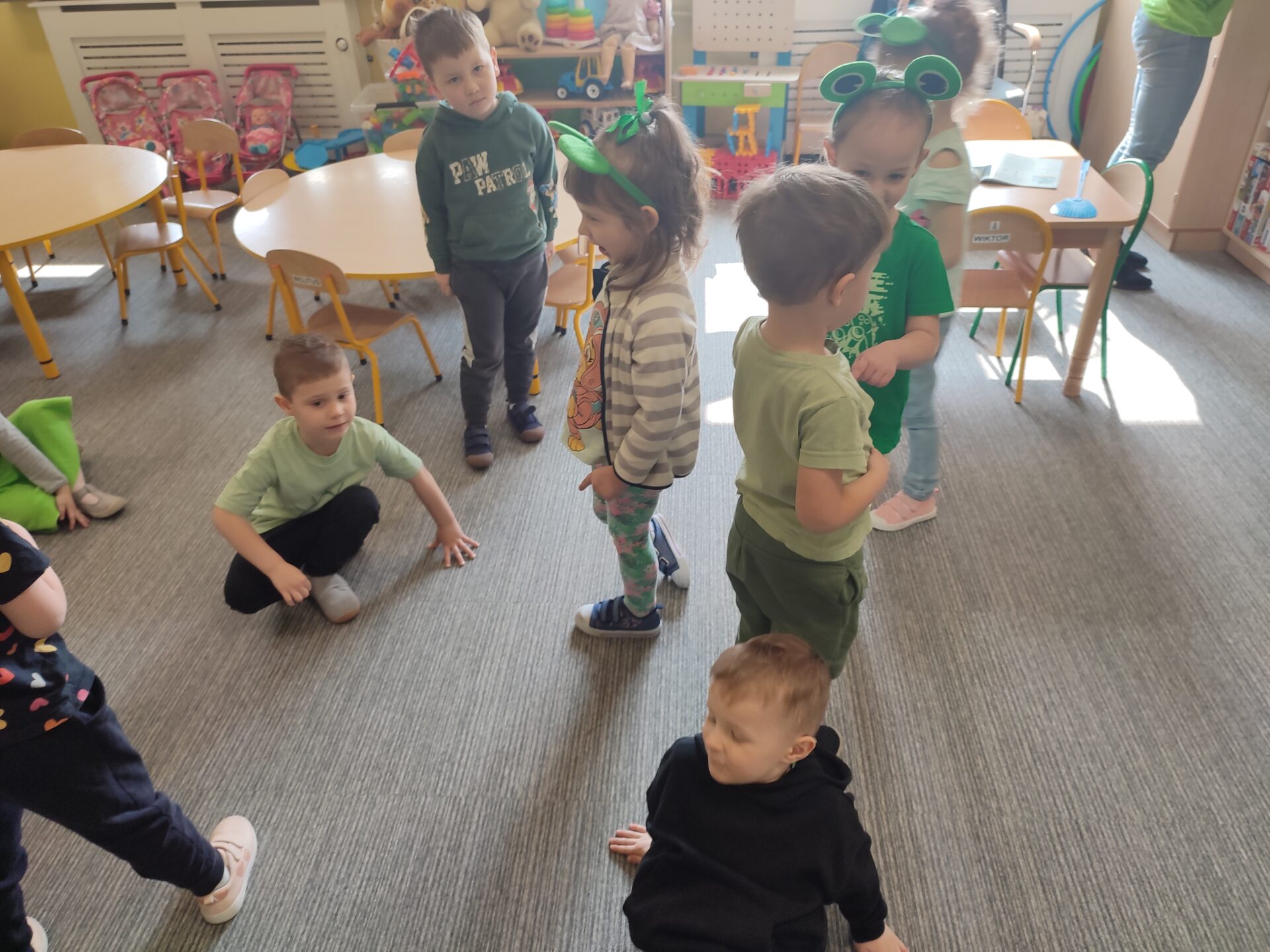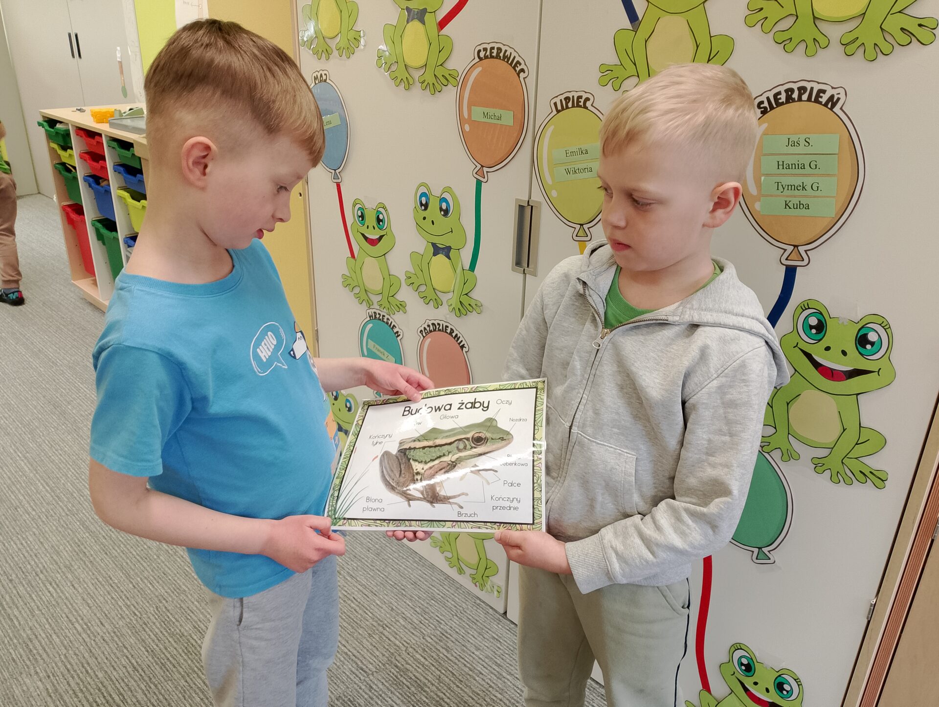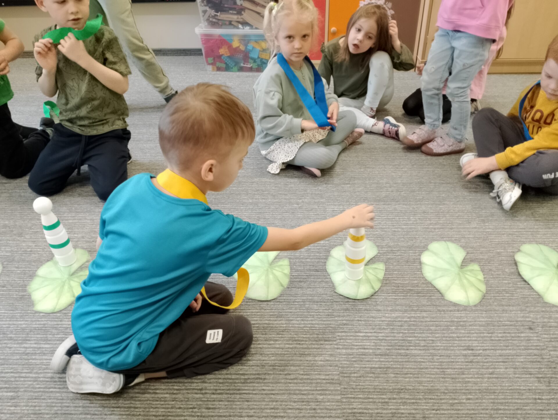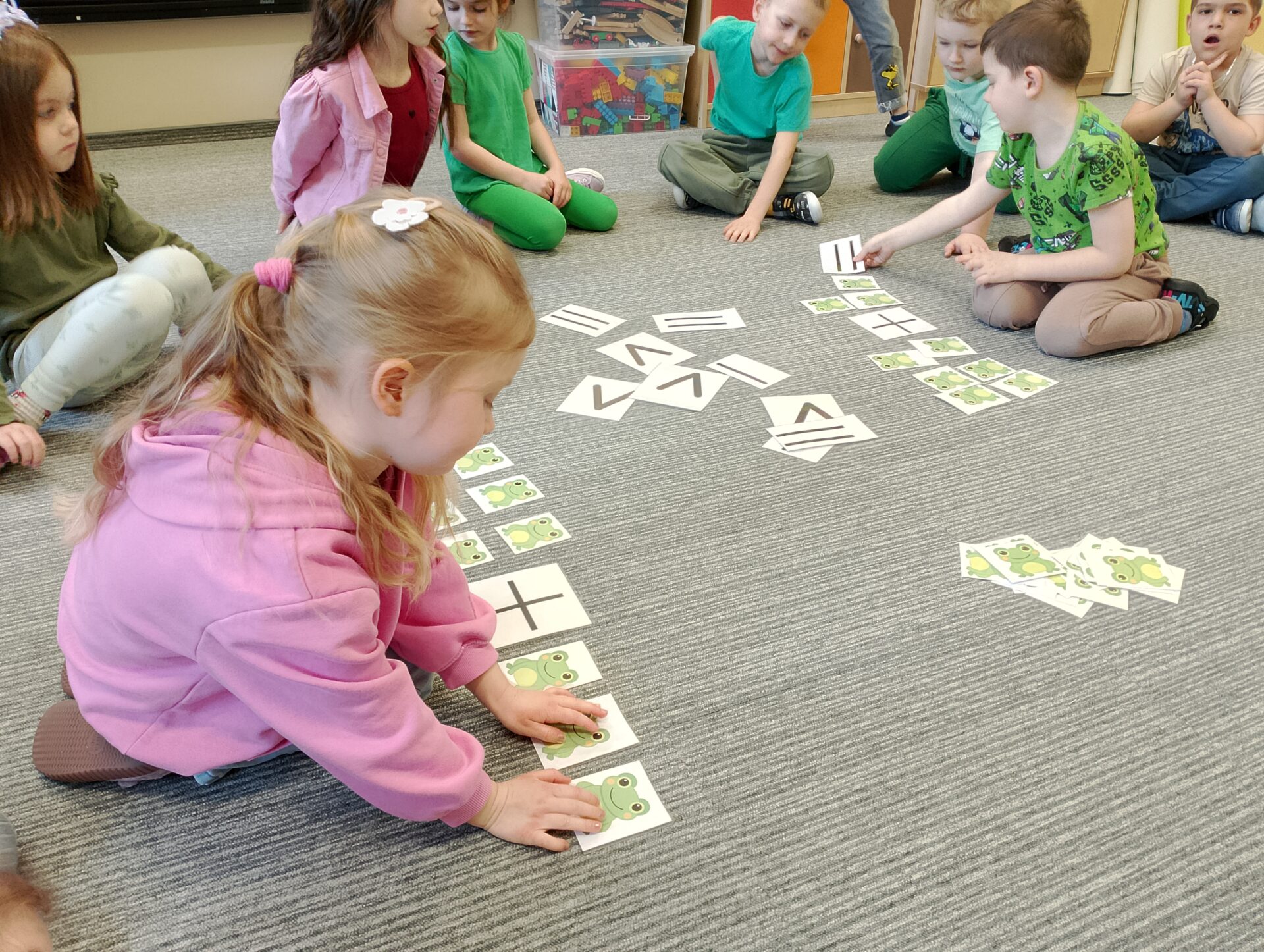 W naszym przedszkolu odbył się pełen radości i aktywności Dzień Żaby. Tego dnia dzieci przyszły ubrane w zielone stroje, dzięki czemu od samego rana panowała wyjątkowa, „żabia” atmosfera. Podczas zajęć przedszkolaki poznały wiele ciekawostek na temat życia żab – dowiedziały się, gdzie żyją, czym się odżywiają oraz jak wygląda ich rozwój. Dzieci uczyły się także określać kolejne etapy cyklu rozwoju żaby, co było nie tylko ciekawe, ale i bardzo pouczające. Nie zabrakło ruchu i dobrej zabawy! Dzieci chętnie brały udział w zabawach ruchowych takich jak „Bocian i żaby” oraz „Żaby i muchy”, które dostarczyły mnóstwo śmiechu i pozytywnej energii. Dużym zainteresowaniem cieszyła się gra planszowa XXL „Żabia”, podczas której „Skaczące Żabki” pracowały w grupach, ucząc się współpracy i zdrowej rywalizacji. Przedszkolaki ćwiczyły również pamięć, biorąc udział w grze memory o tematyce żabiej. Starsze dzieci rozwijały również swoje umiejętności matematyczne podczas „żabiej matematyki” – dodawały i odejmowały, a także porównywały liczebność zbiorów, określając, w którym jest więcej żab, używając znaków większości i mniejszości.