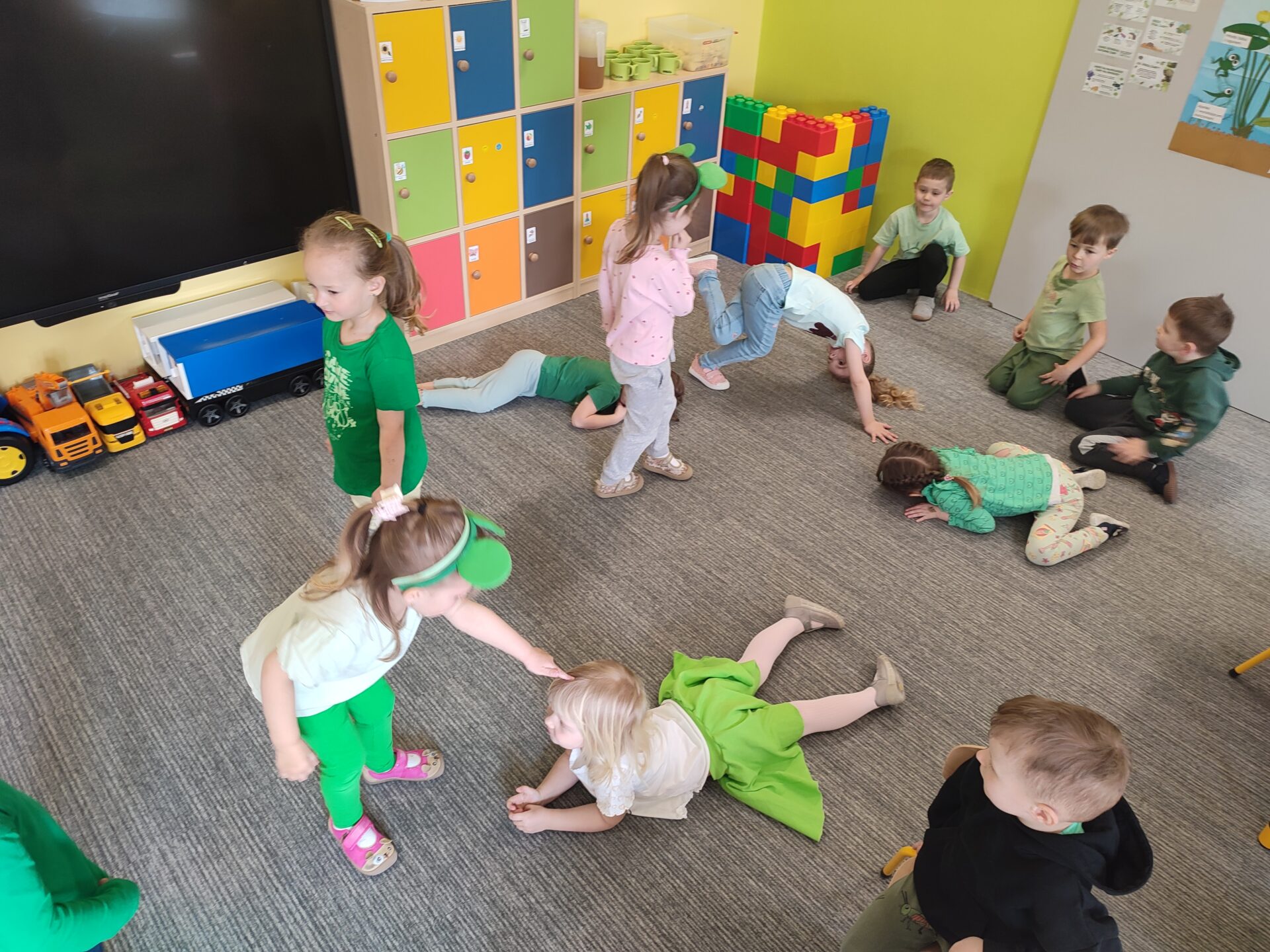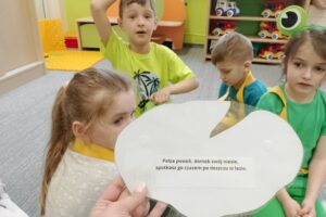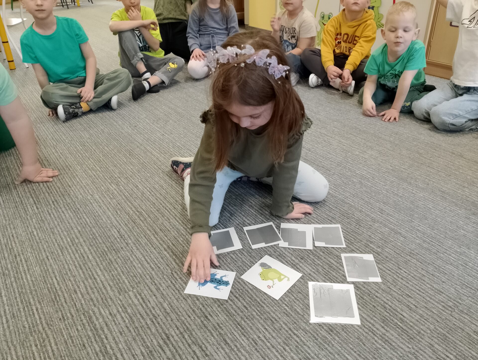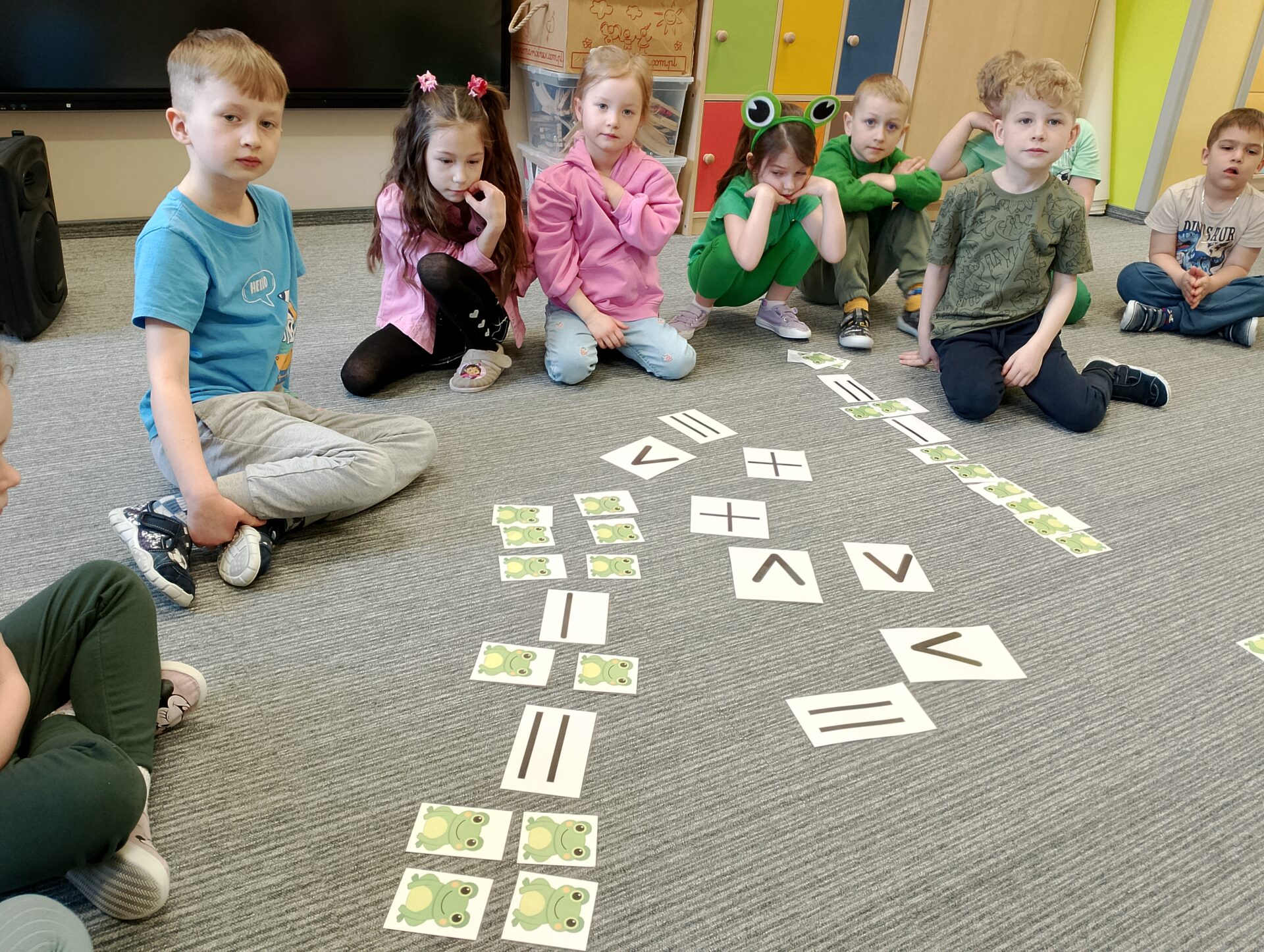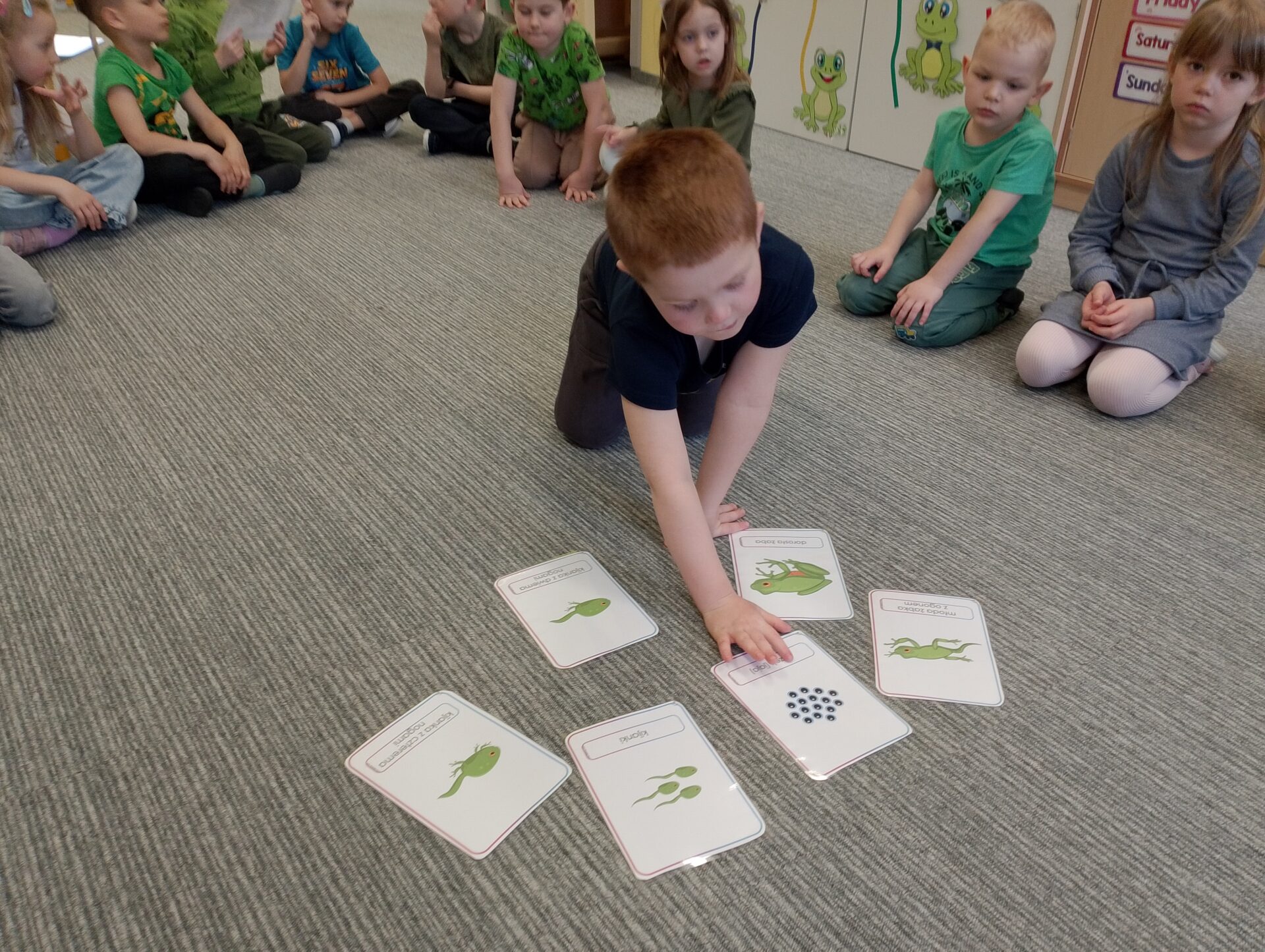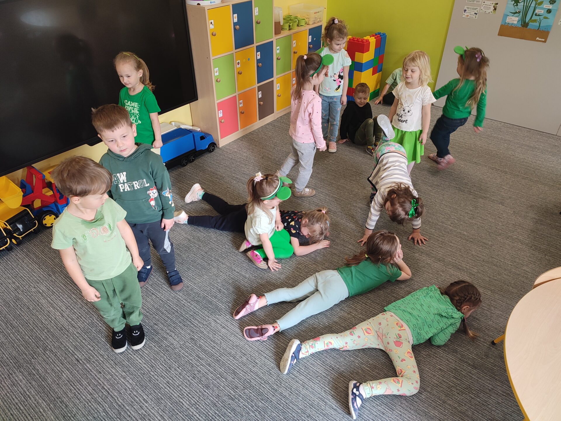 W naszym przedszkolu odbył się pełen radości i aktywności Dzień Żaby. Tego dnia dzieci przyszły ubrane w zielone stroje, dzięki czemu od samego rana panowała wyjątkowa, „żabia” atmosfera. Podczas zajęć przedszkolaki poznały wiele ciekawostek na temat życia żab – dowiedziały się, gdzie żyją, czym się odżywiają oraz jak wygląda ich rozwój. Dzieci uczyły się także określać kolejne etapy cyklu rozwoju żaby, co było nie tylko ciekawe, ale i bardzo pouczające. Nie zabrakło ruchu i dobrej zabawy! Dzieci chętnie brały udział w zabawach ruchowych takich jak „Bocian i żaby” oraz „Żaby i muchy”, które dostarczyły mnóstwo śmiechu i pozytywnej energii. Dużym zainteresowaniem cieszyła się gra planszowa XXL „Żabia”, podczas której „Skaczące Żabki” pracowały w grupach, ucząc się współpracy i zdrowej rywalizacji. Przedszkolaki ćwiczyły również pamięć, biorąc udział w grze memory o tematyce żabiej. Starsze dzieci rozwijały również swoje umiejętności matematyczne podczas „żabiej matematyki” – dodawały i odejmowały, a także porównywały liczebność zbiorów, określając, w którym jest więcej żab, używając znaków większości i mniejszości.