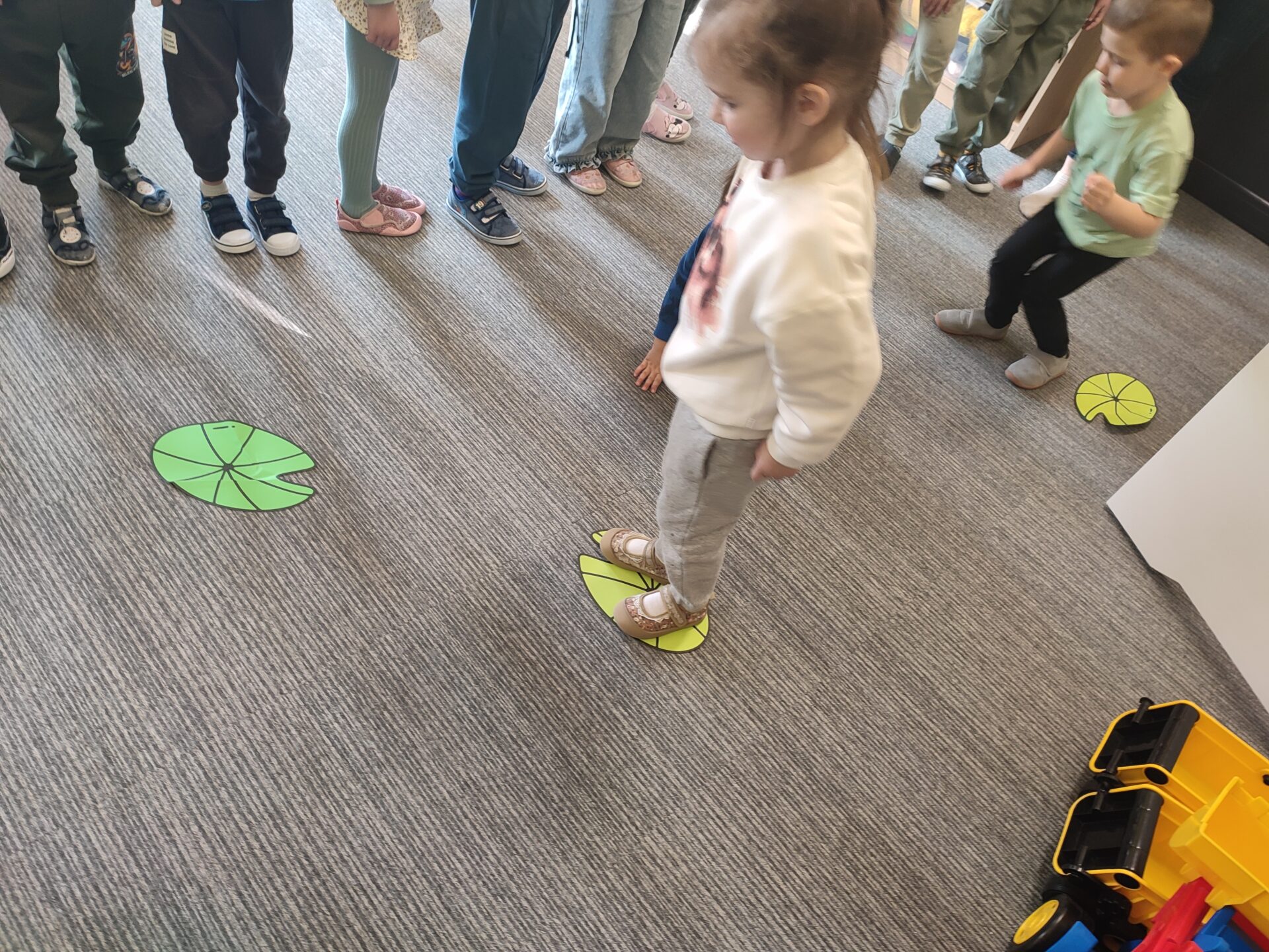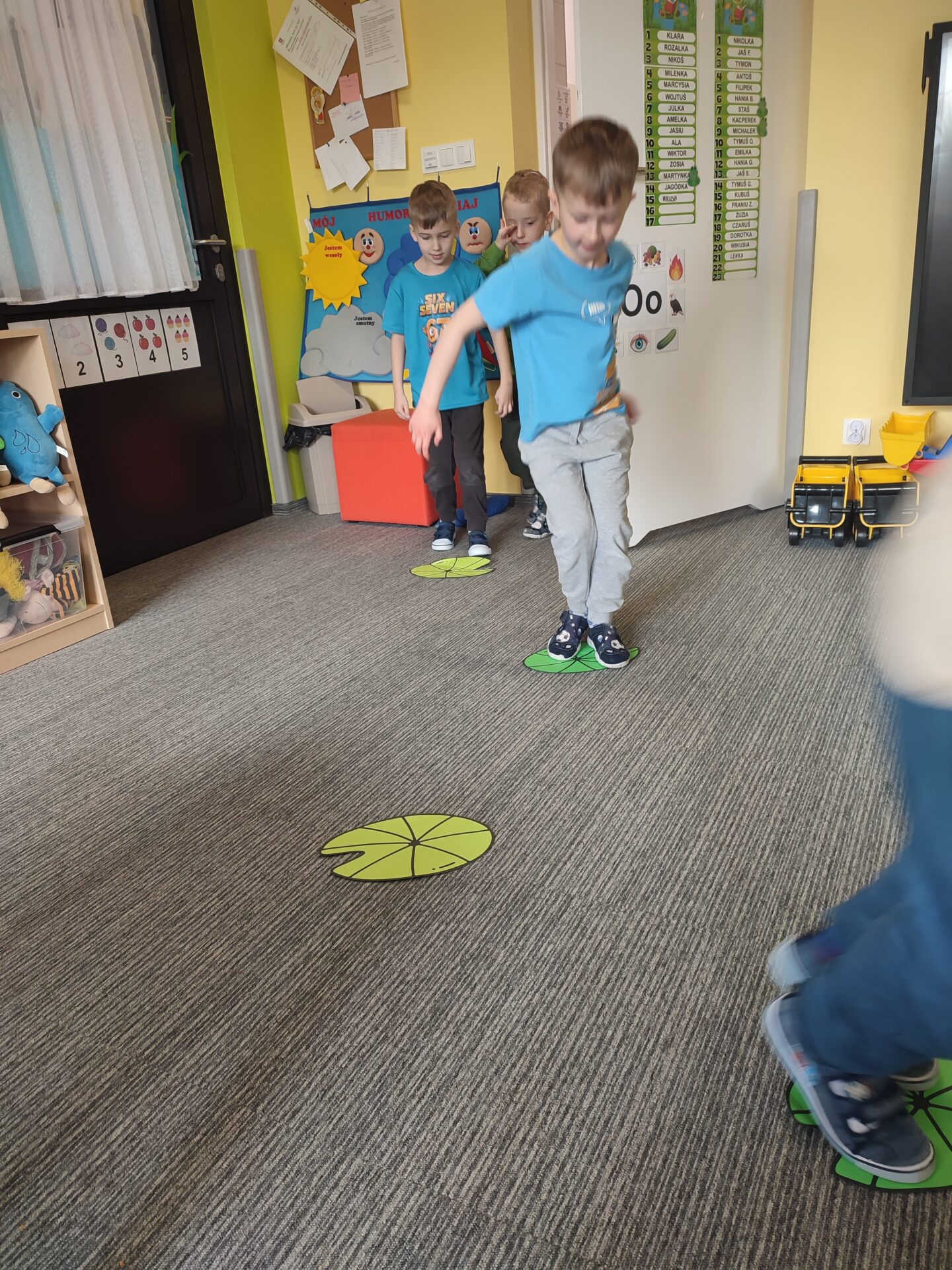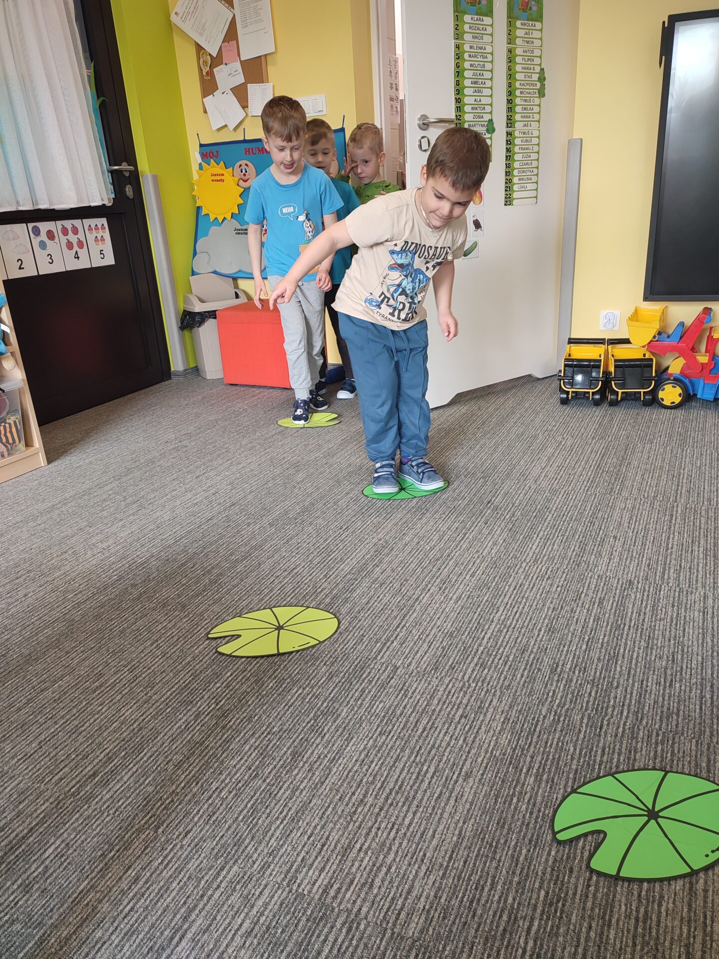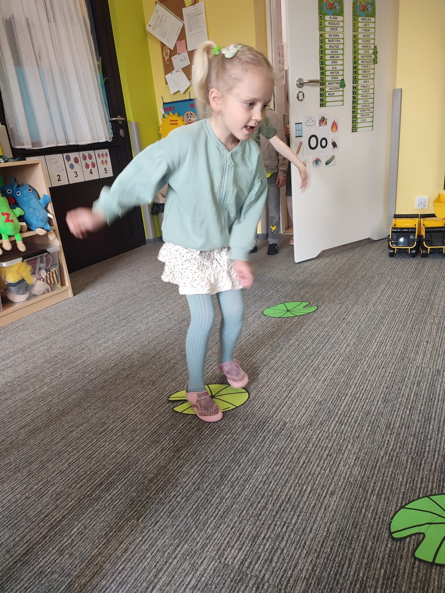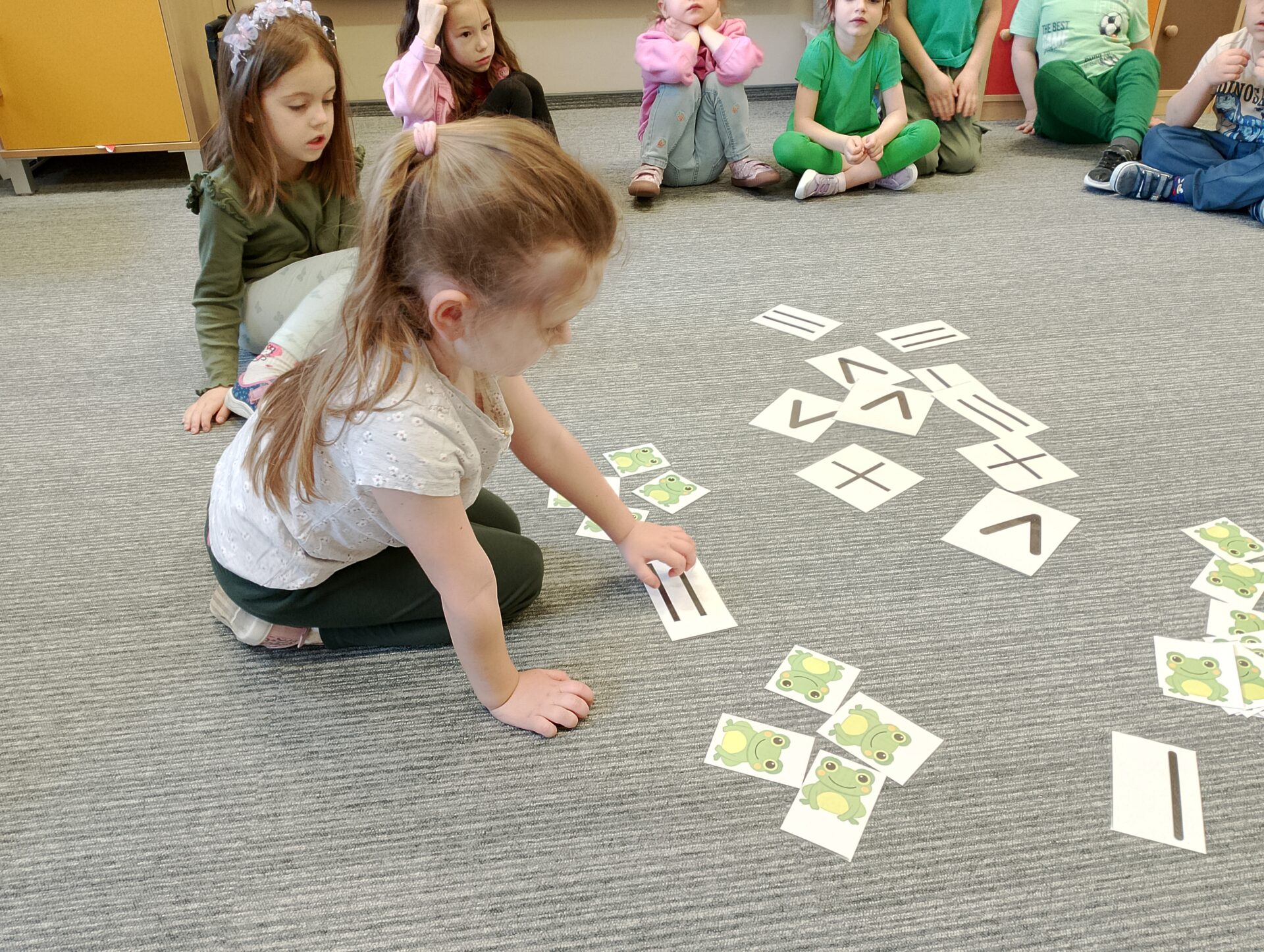 W naszym przedszkolu odbył się pełen radości i aktywności Dzień Żaby. Tego dnia dzieci przyszły ubrane w zielone stroje, dzięki czemu od samego rana panowała wyjątkowa, „żabia” atmosfera. Podczas zajęć przedszkolaki poznały wiele ciekawostek na temat życia żab – dowiedziały się, gdzie żyją, czym się odżywiają oraz jak wygląda ich rozwój. Dzieci uczyły się także określać kolejne etapy cyklu rozwoju żaby, co było nie tylko ciekawe, ale i bardzo pouczające. Nie zabrakło ruchu i dobrej zabawy! Dzieci chętnie brały udział w zabawach ruchowych takich jak „Bocian i żaby” oraz „Żaby i muchy”, które dostarczyły mnóstwo śmiechu i pozytywnej energii. Dużym zainteresowaniem cieszyła się gra planszowa XXL „Żabia”, podczas której „Skaczące Żabki” pracowały w grupach, ucząc się współpracy i zdrowej rywalizacji. Przedszkolaki ćwiczyły również pamięć, biorąc udział w grze memory o tematyce żabiej. Starsze dzieci rozwijały również swoje umiejętności matematyczne podczas „żabiej matematyki” – dodawały i odejmowały, a także porównywały liczebność zbiorów, określając, w którym jest więcej żab, używając znaków większości i mniejszości.