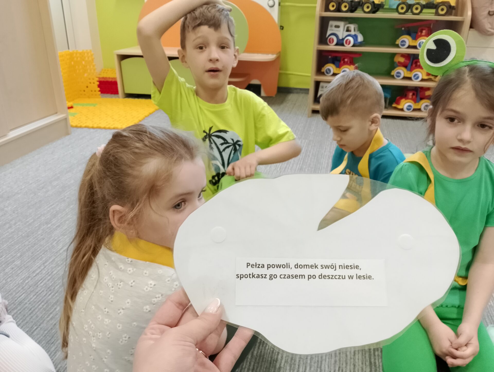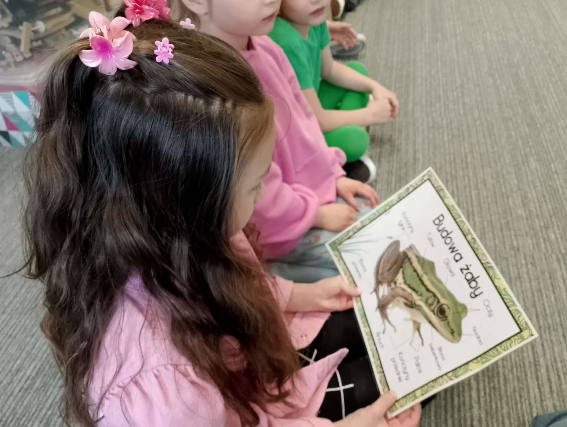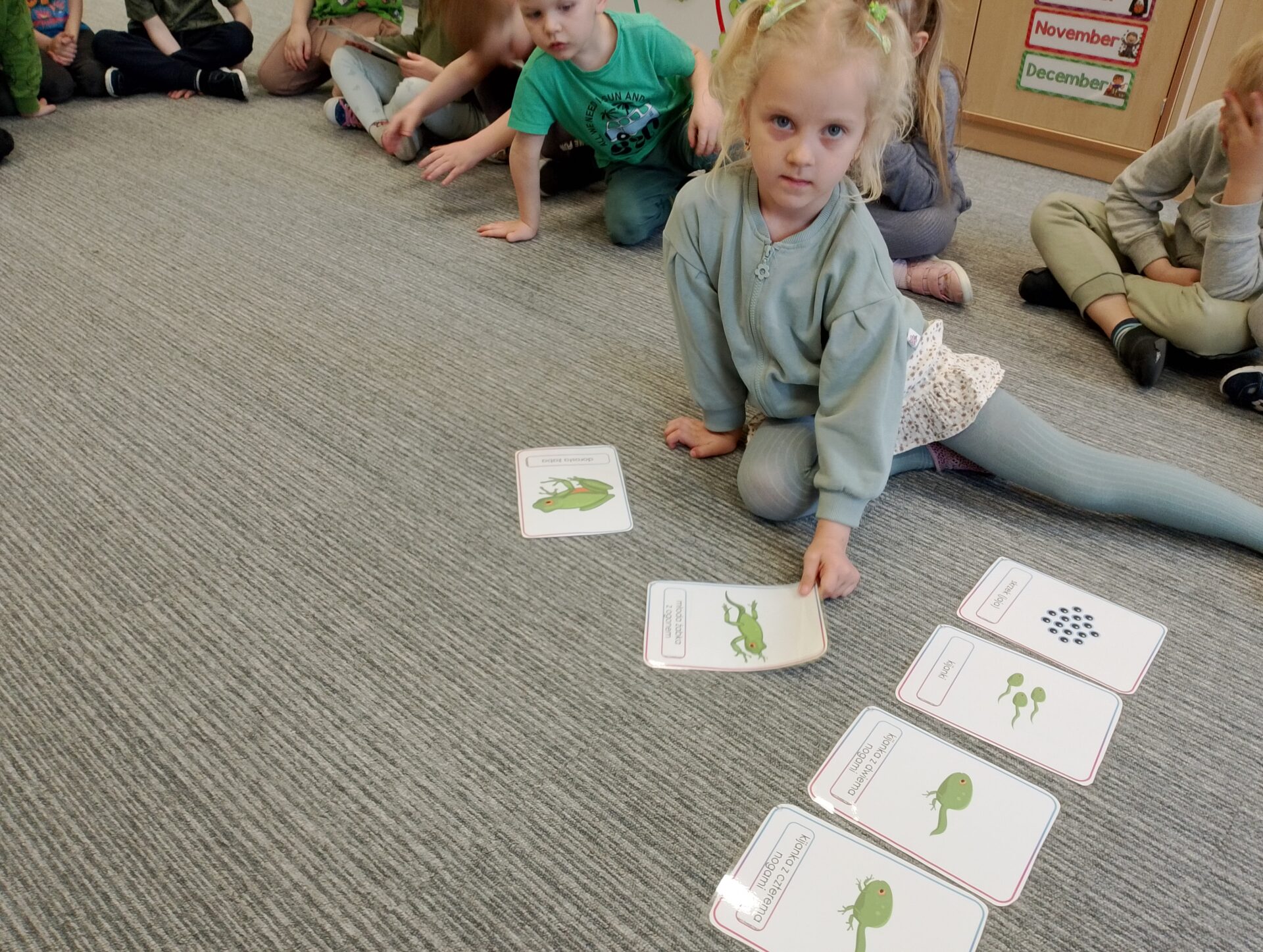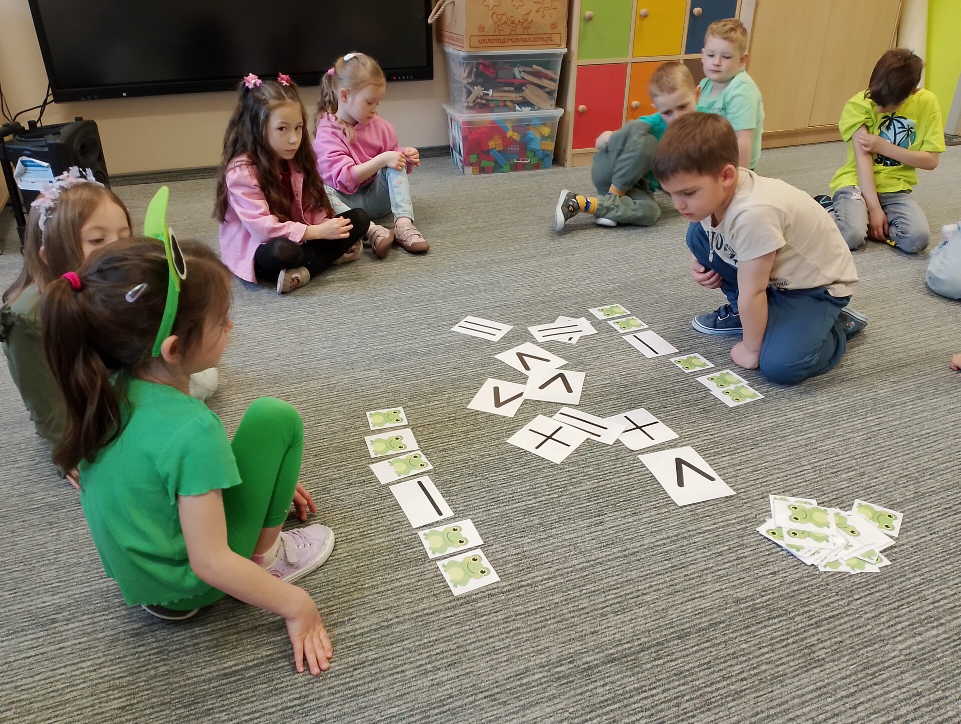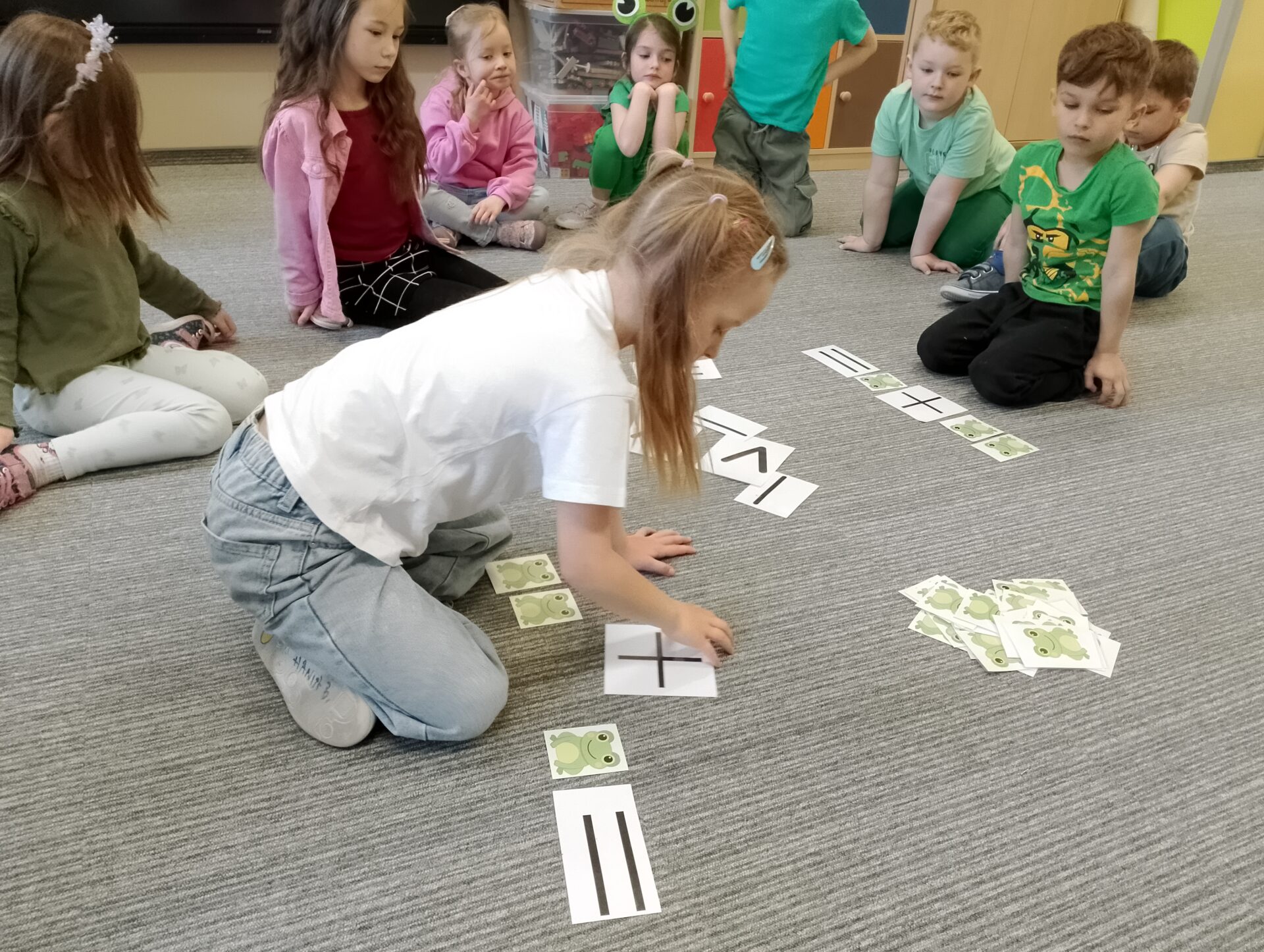W naszym przedszkolu odbył się pełen radości i aktywności Dzień Żaby. Tego dnia dzieci przyszły ubrane w zielone stroje, dzięki czemu od samego rana panowała wyjątkowa, „żabia” atmosfera. Podczas zajęć przedszkolaki poznały wiele ciekawostek na temat życia żab – dowiedziały się, gdzie żyją, czym się odżywiają oraz jak wygląda ich rozwój. Dzieci uczyły się także określać kolejne etapy cyklu rozwoju żaby, co było nie tylko ciekawe, ale i bardzo pouczające. Nie zabrakło ruchu i dobrej zabawy! Dzieci chętnie brały udział w zabawach ruchowych takich jak „Bocian i żaby” oraz „Żaby i muchy”, które dostarczyły mnóstwo śmiechu i pozytywnej energii. Dużym zainteresowaniem cieszyła się gra planszowa XXL „Żabia”, podczas której „Skaczące Żabki” pracowały w grupach, ucząc się współpracy i zdrowej rywalizacji. Przedszkolaki ćwiczyły również pamięć, biorąc udział w grze memory o tematyce żabiej. Starsze dzieci rozwijały również swoje umiejętności matematyczne podczas „żabiej matematyki” – dodawały i odejmowały, a także porównywały liczebność zbiorów, określając, w którym jest więcej żab, używając znaków większości i mniejszości.