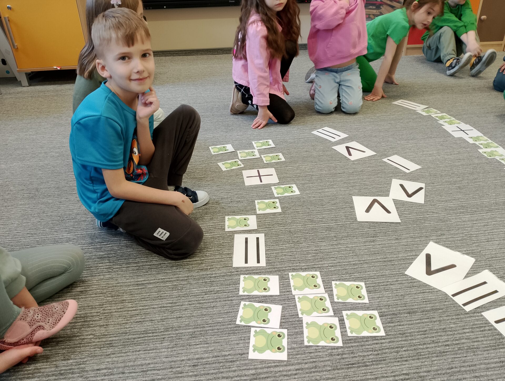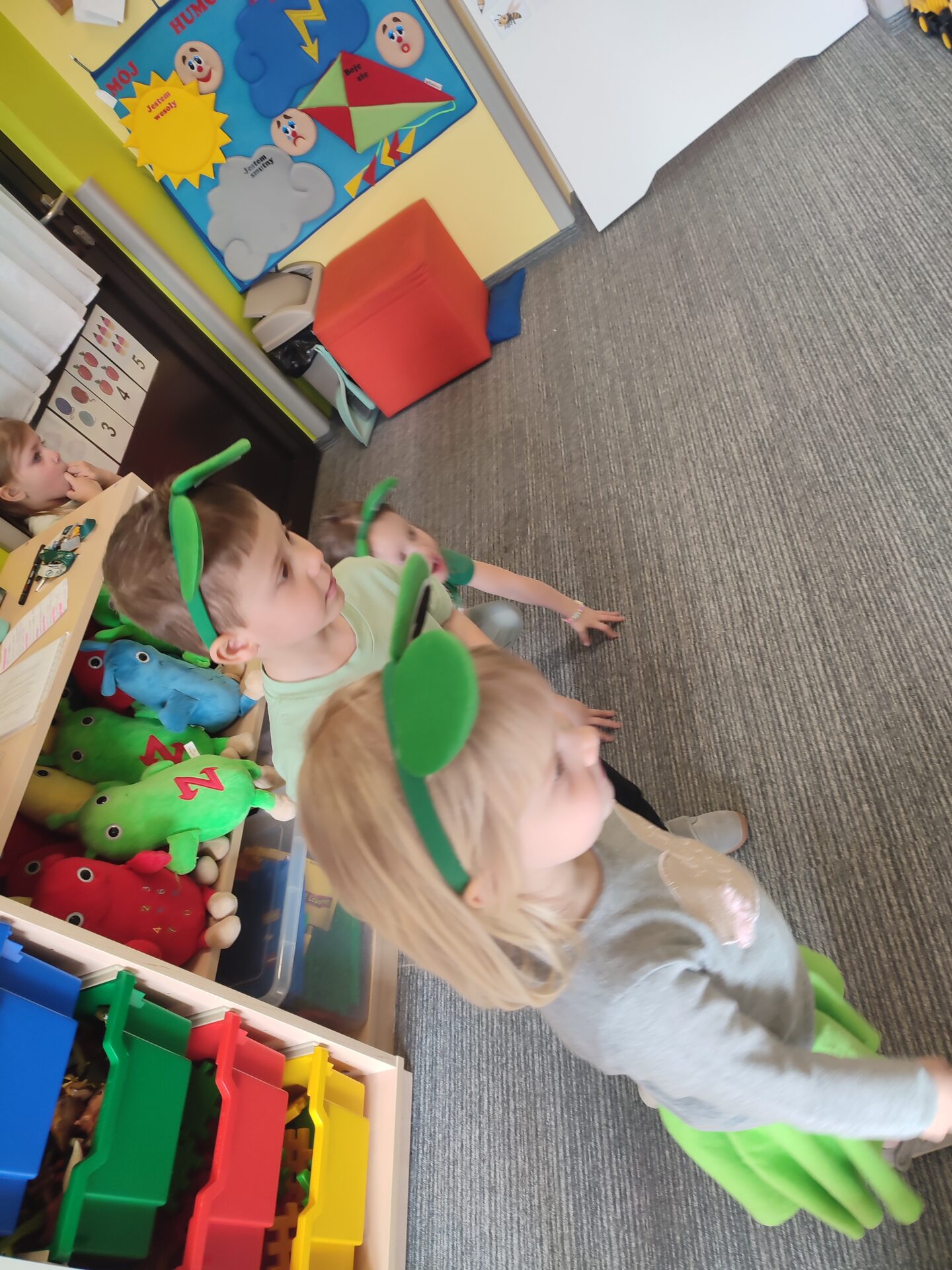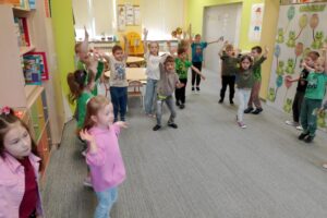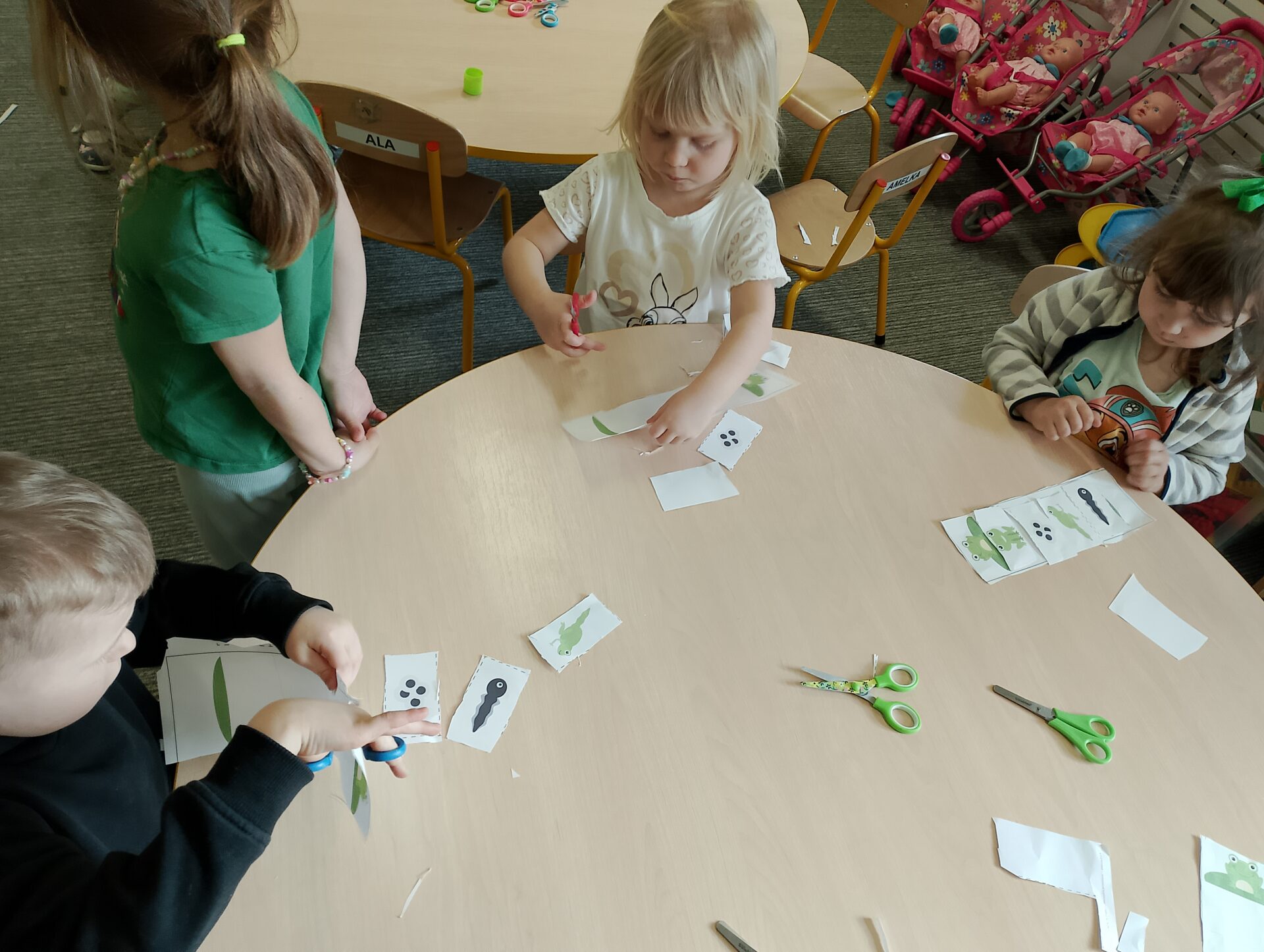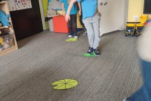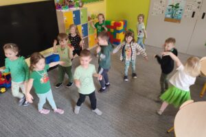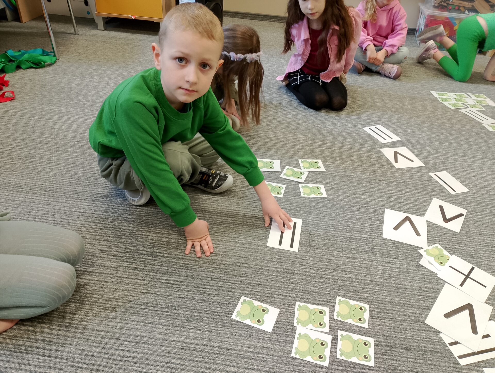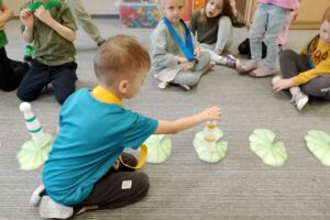 W naszym przedszkolu odbył się pełen radości i aktywności Dzień Żaby. Tego dnia dzieci przyszły ubrane w zielone stroje, dzięki czemu od samego rana panowała wyjątkowa, „żabia” atmosfera. Podczas zajęć przedszkolaki poznały wiele ciekawostek na temat życia żab – dowiedziały się, gdzie żyją, czym się odżywiają oraz jak wygląda ich rozwój. Dzieci uczyły się także określać kolejne etapy cyklu rozwoju żaby, co było nie tylko ciekawe, ale i bardzo pouczające. Nie zabrakło ruchu i dobrej zabawy! Dzieci chętnie brały udział w zabawach ruchowych takich jak „Bocian i żaby” oraz „Żaby i muchy”, które dostarczyły mnóstwo śmiechu i pozytywnej energii. Dużym zainteresowaniem cieszyła się gra planszowa XXL „Żabia”, podczas której „Skaczące Żabki” pracowały w grupach, ucząc się współpracy i zdrowej rywalizacji. Przedszkolaki ćwiczyły również pamięć, biorąc udział w grze memory o tematyce żabiej. Starsze dzieci rozwijały również swoje umiejętności matematyczne podczas „żabiej matematyki” – dodawały i odejmowały, a także porównywały liczebność zbiorów, określając, w którym jest więcej żab, używając znaków większości i mniejszości.