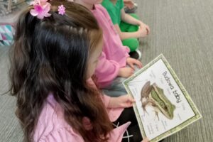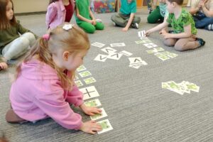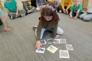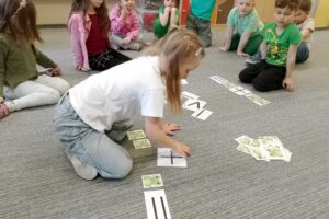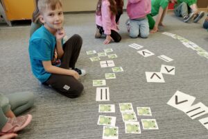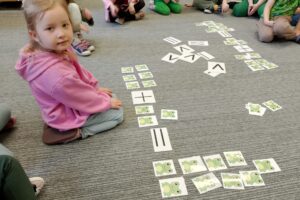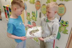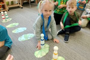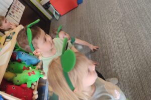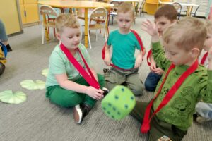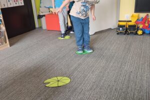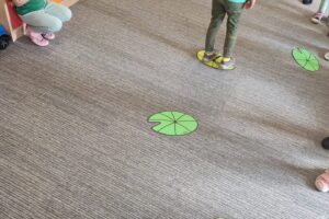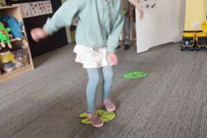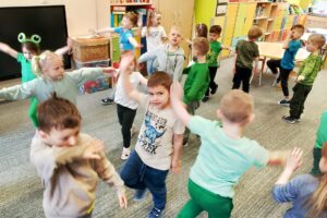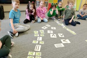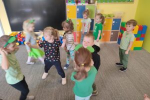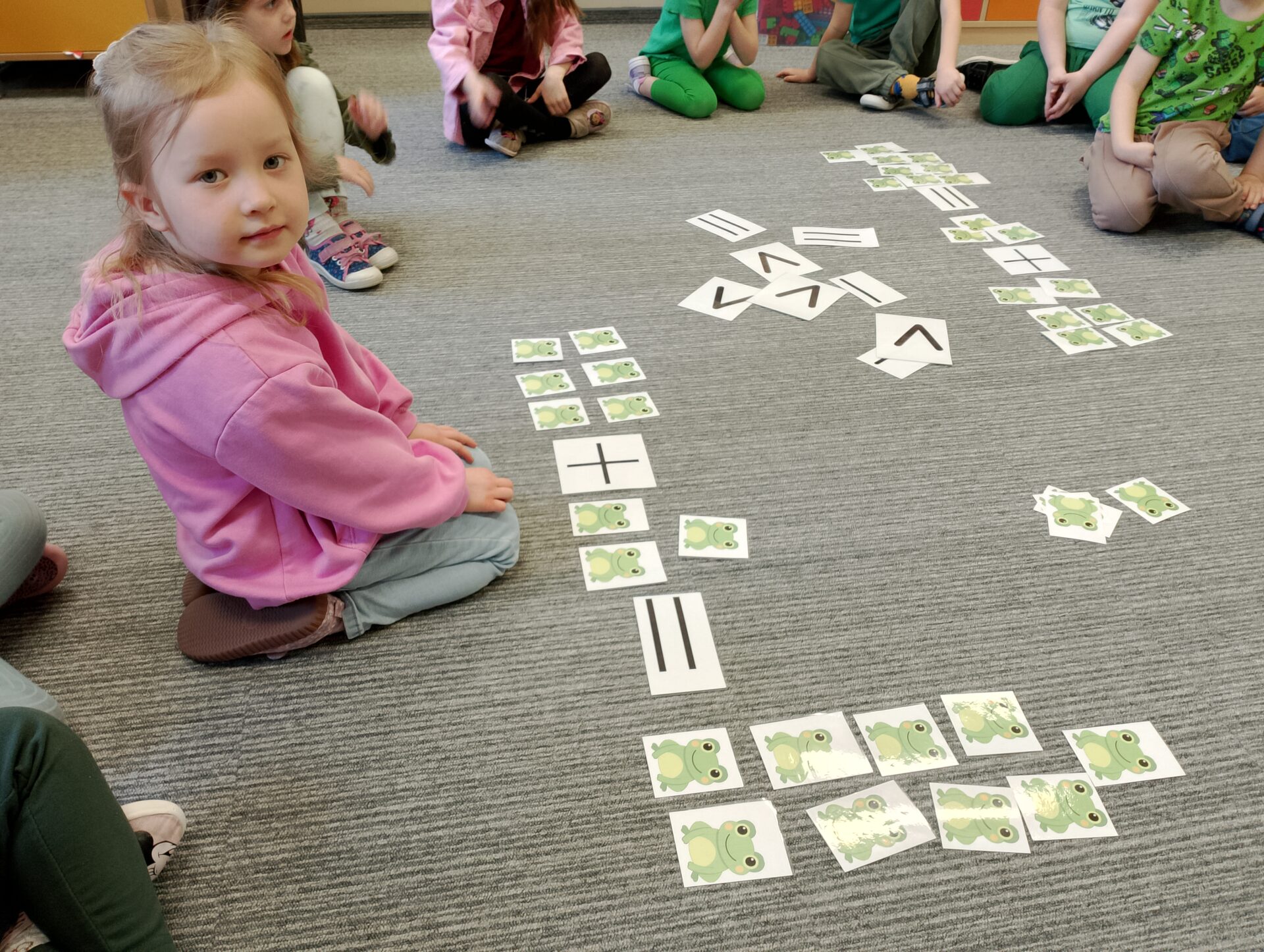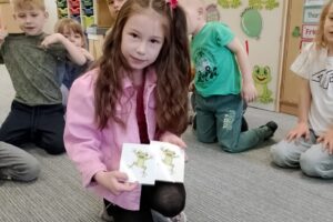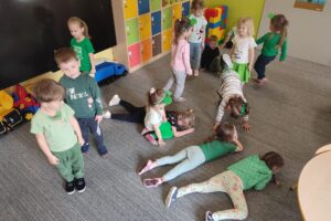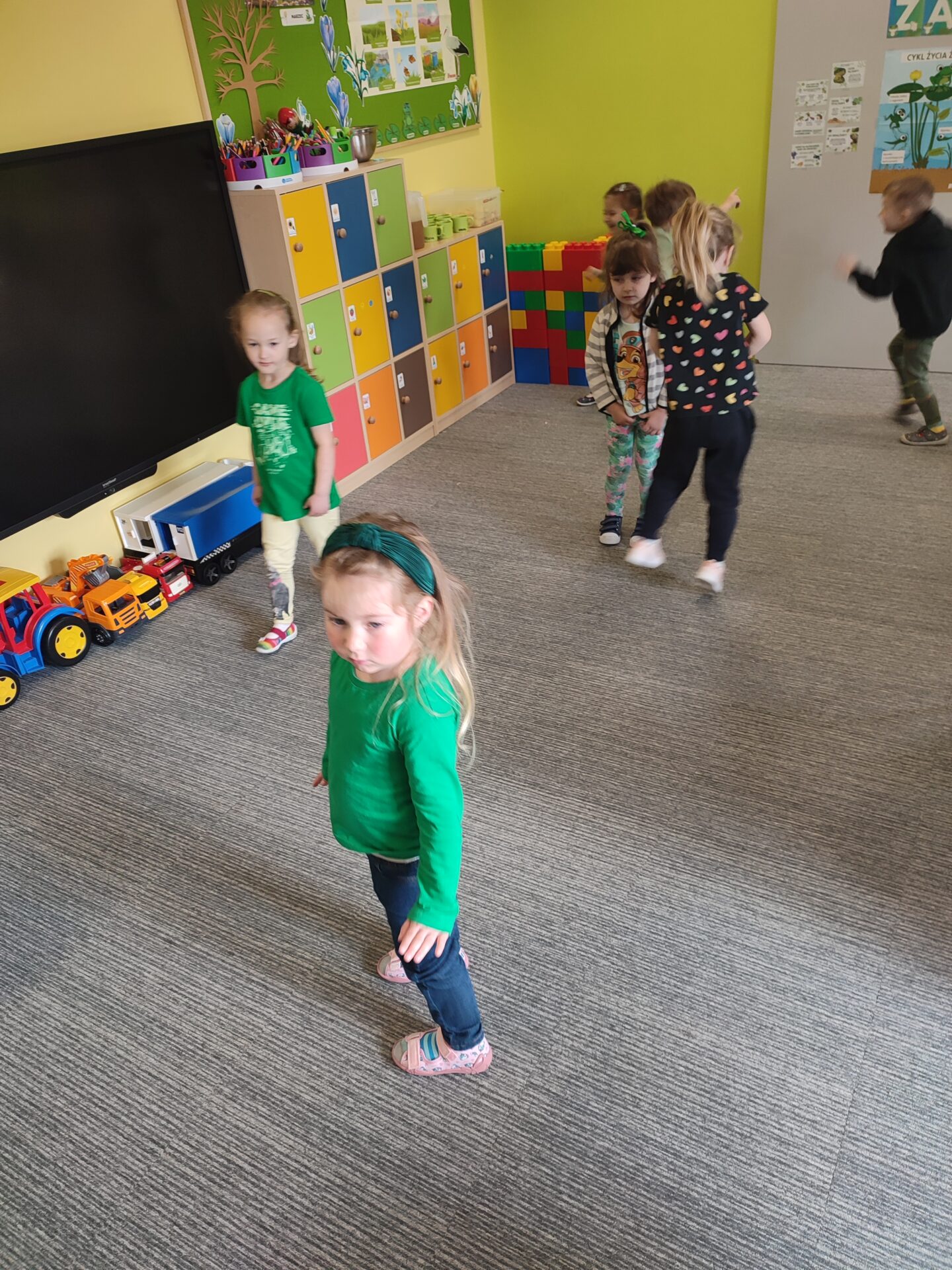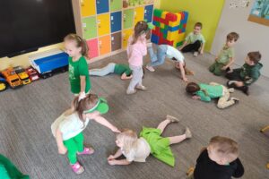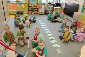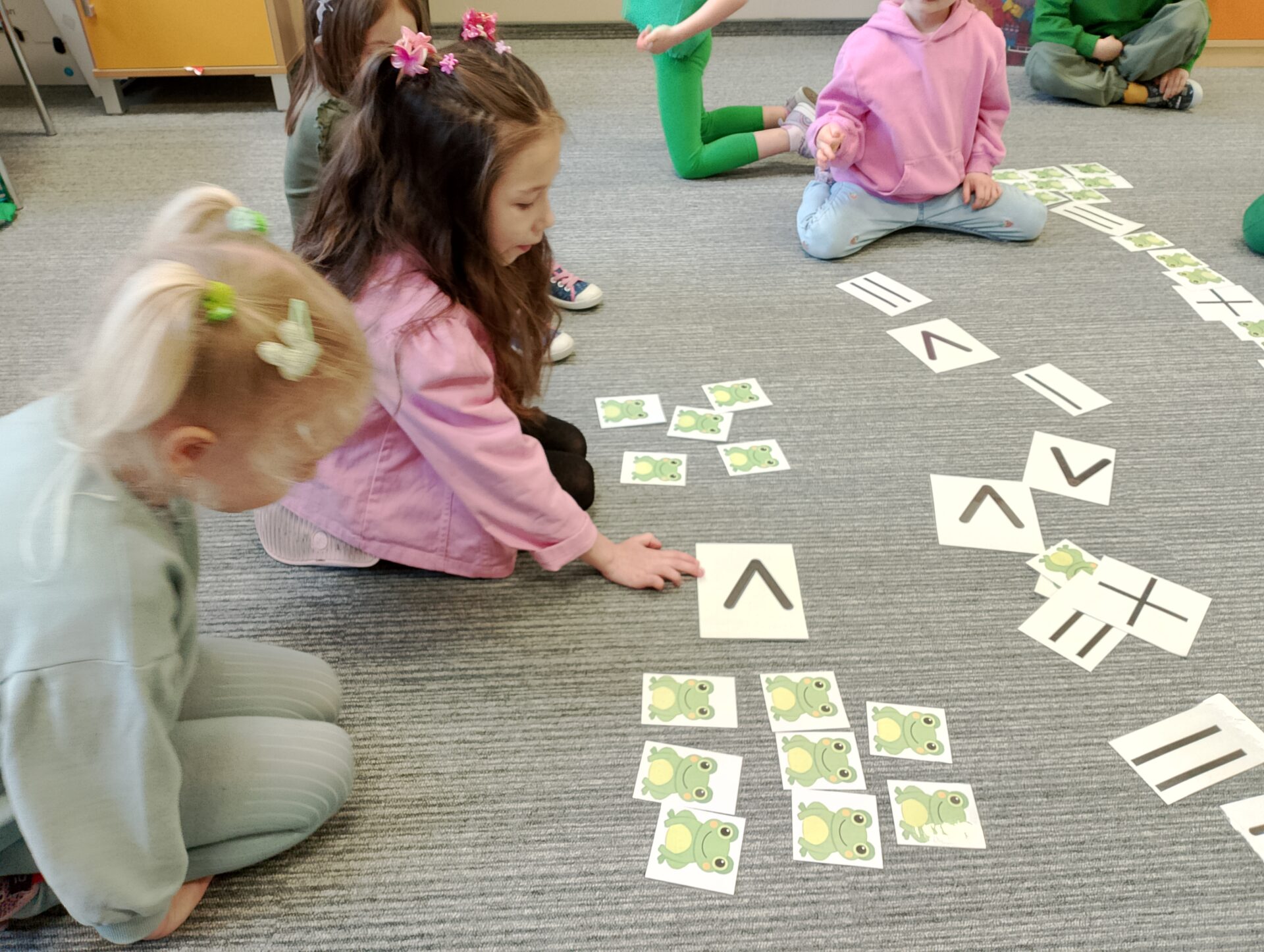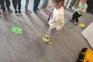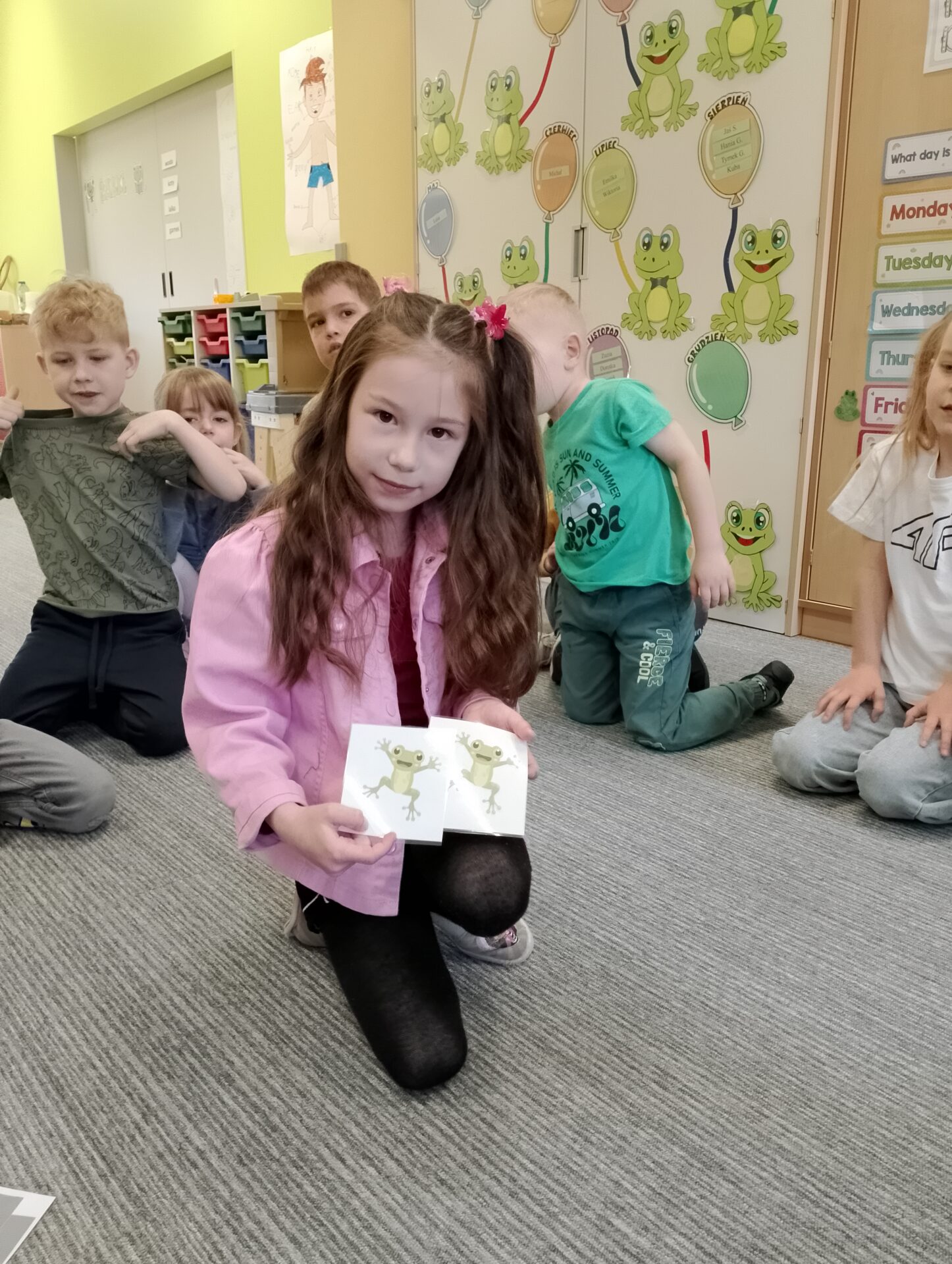 W naszym przedszkolu odbył się pełen radości i aktywności Dzień Żaby. Tego dnia dzieci przyszły ubrane w zielone stroje, dzięki czemu od samego rana panowała wyjątkowa, „żabia” atmosfera. Podczas zajęć przedszkolaki poznały wiele ciekawostek na temat życia żab – dowiedziały się, gdzie żyją, czym się odżywiają oraz jak wygląda ich rozwój. Dzieci uczyły się także określać kolejne etapy cyklu rozwoju żaby, co było nie tylko ciekawe, ale i bardzo pouczające. Nie zabrakło ruchu i dobrej zabawy! Dzieci chętnie brały udział w zabawach ruchowych takich jak „Bocian i żaby” oraz „Żaby i muchy”, które dostarczyły mnóstwo śmiechu i pozytywnej energii. Dużym zainteresowaniem cieszyła się gra planszowa XXL „Żabia”, podczas której „Skaczące Żabki” pracowały w grupach, ucząc się współpracy i zdrowej rywalizacji. Przedszkolaki ćwiczyły również pamięć, biorąc udział w grze memory o tematyce żabiej. Starsze dzieci rozwijały również swoje umiejętności matematyczne podczas „żabiej matematyki” – dodawały i odejmowały, a także porównywały liczebność zbiorów, określając, w którym jest więcej żab, używając znaków większości i mniejszości.